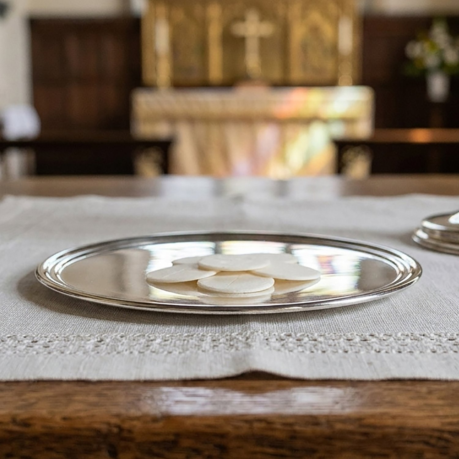 Patena é um recipiente em forma de prato onde se colocam as partículas da Santa Missa para consagração.