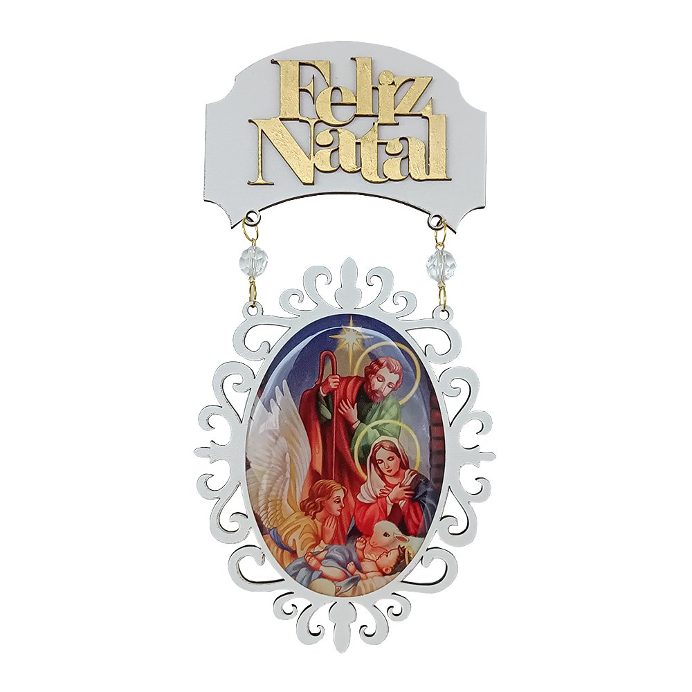 Natal Placa Oval MDF Branco Feliz Natal Sagrada Família