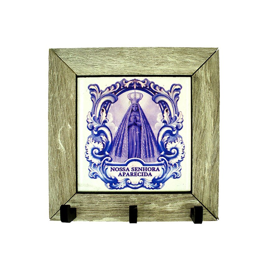 Porta Chave Azulejo Moldura Cinza Nossa Senhora Aparecida Azul