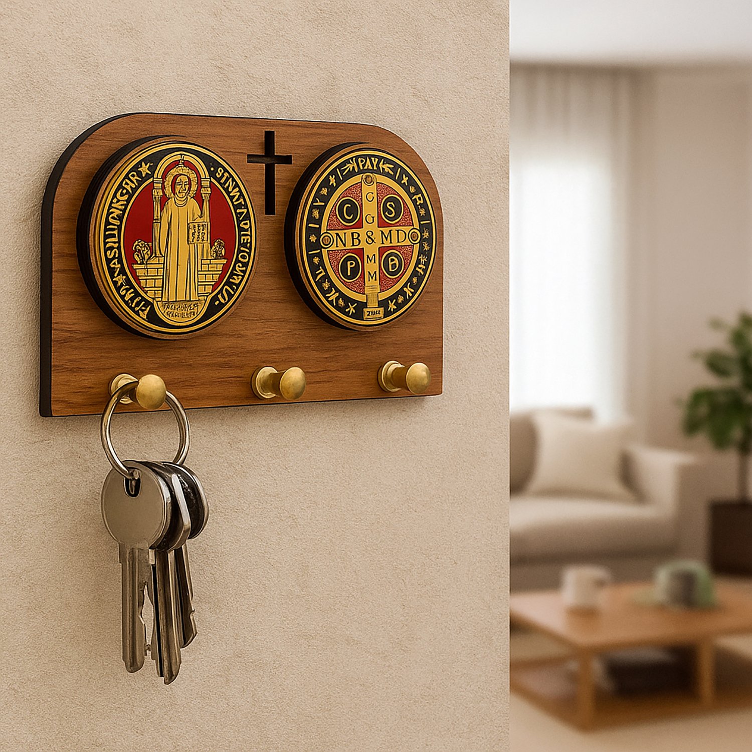 Porta chaves produzido em MDF, 3 pinos para colocação de chaves, medalhas de São Bento adesivo resinado.