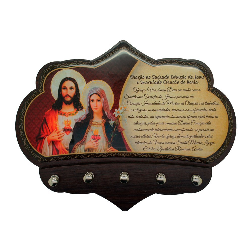 Porta chave produzido em MDF 6mm cor marrom com designe diferenciado, 5 pinos para colocação de chave, foto e oração do Sagrado Coração de Jesus e Imaculado Coração de Maria, resinada. Medindo aproximadamente 16,5 cm de altura 21 cm de largura e 1 cm de comprimento. Fabricação própria.