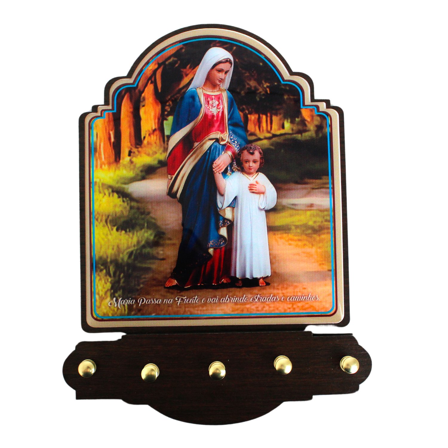 Porta chave produzido em MDF 6mm cor tabaco, 5 pinos para colocação de chave, foto de Maria Passa na Frente, resinado. Medindo aproximadamente 21 cm de altura 16 cm de largura e 1,5 cm de comprimento. Fabricação própria.