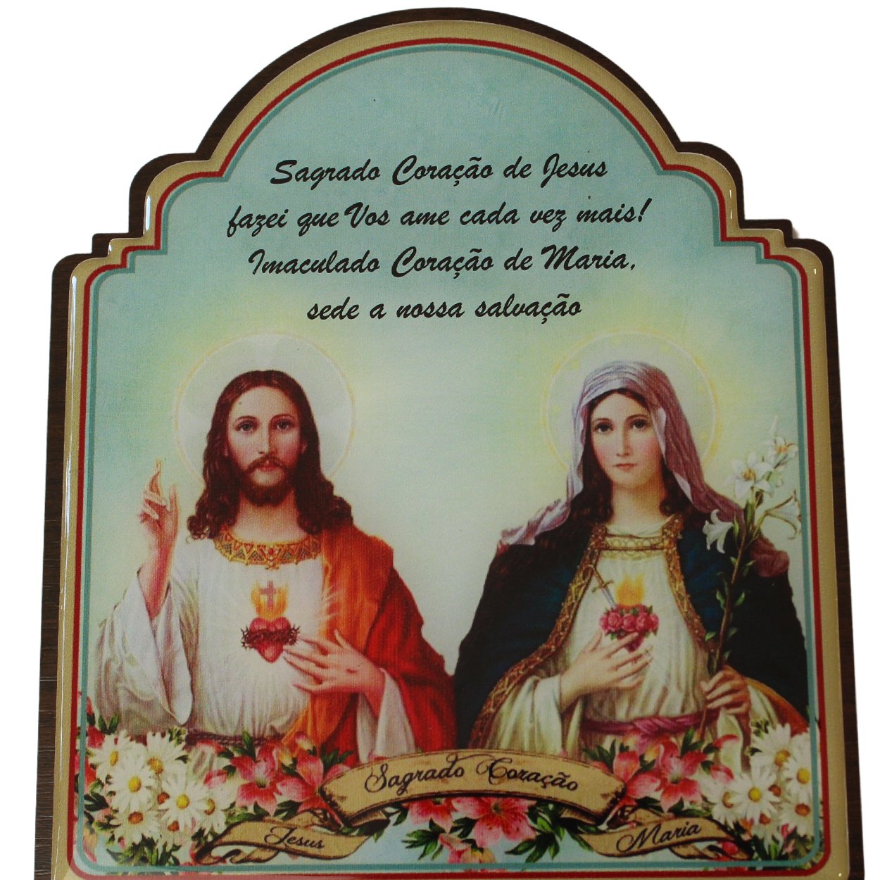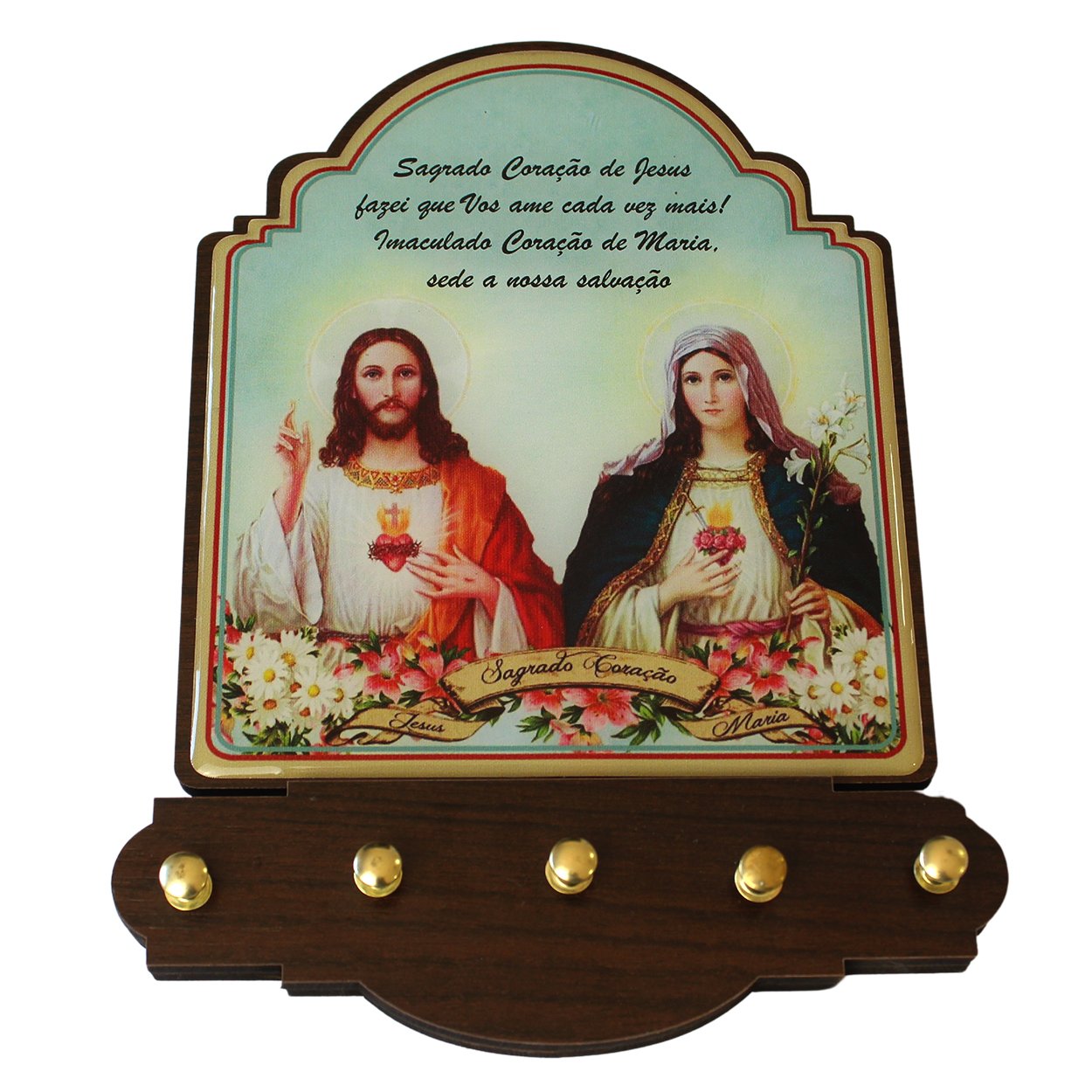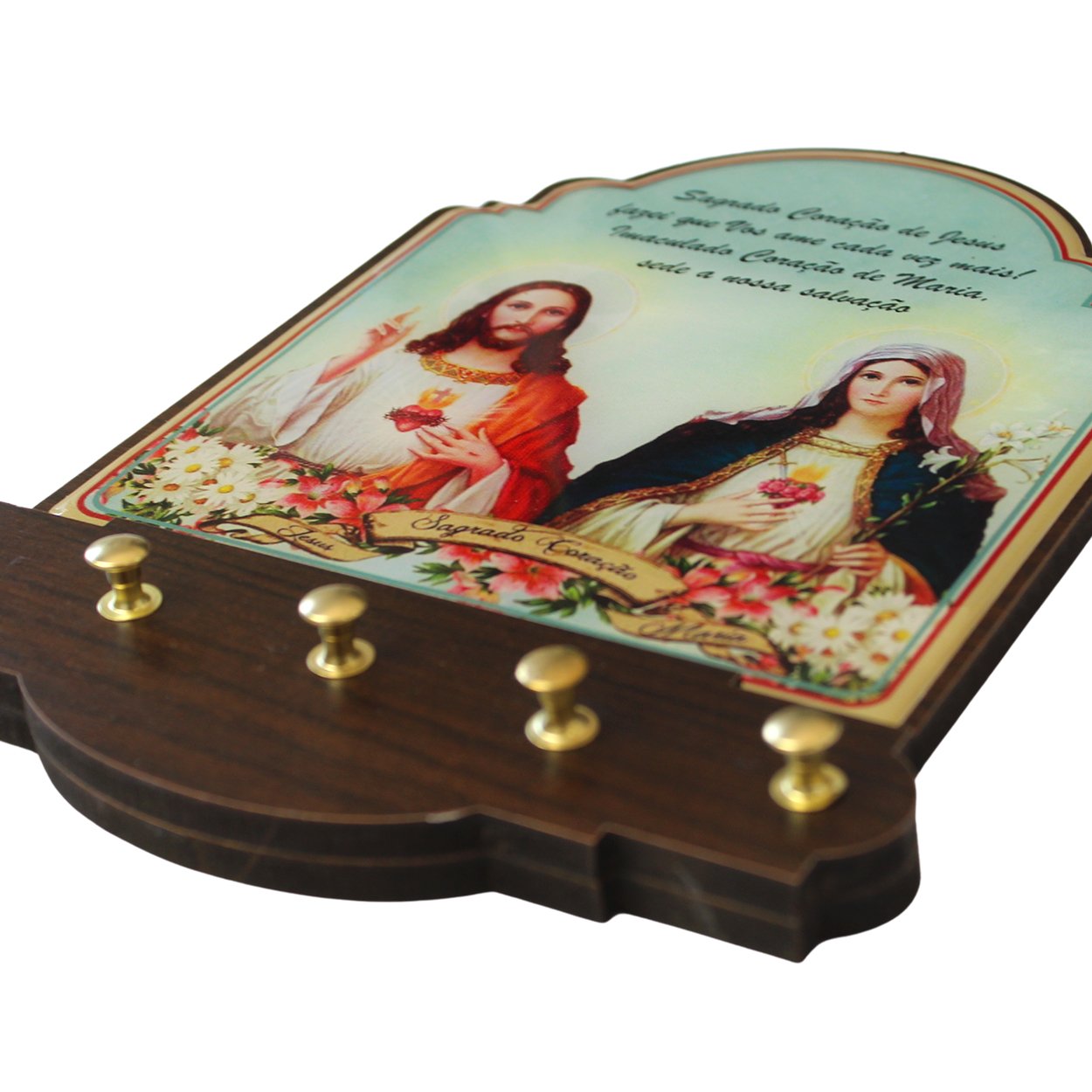 Porta chaves produzido em MDF 6mm na cor marrom, 5 pinos para colocação de chaves, imagem do Sagrado Coração de Jesus e Imaculado Coração de Maria resinada. Fabricação própria.