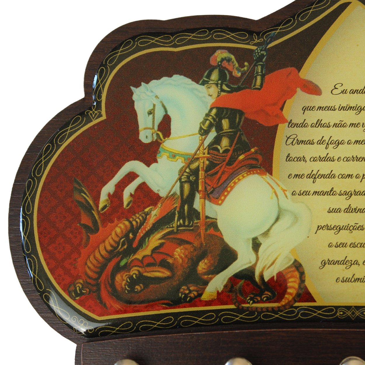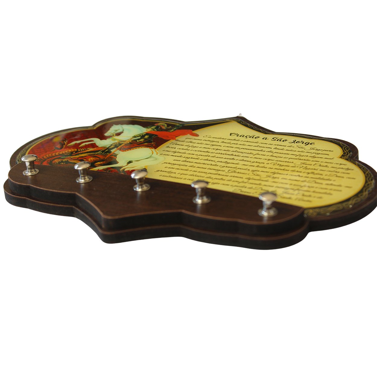 Porta chave produzido em MDF 6mm cor tabaco com designe diferenciado, 5 pinos para colocação de chave, foto e oração de São Jorge, resinadas. Medindo aproximadamente 16,5 cm de altura 21 cm de largura e 1 cm de comprimento. Fabricação própria.