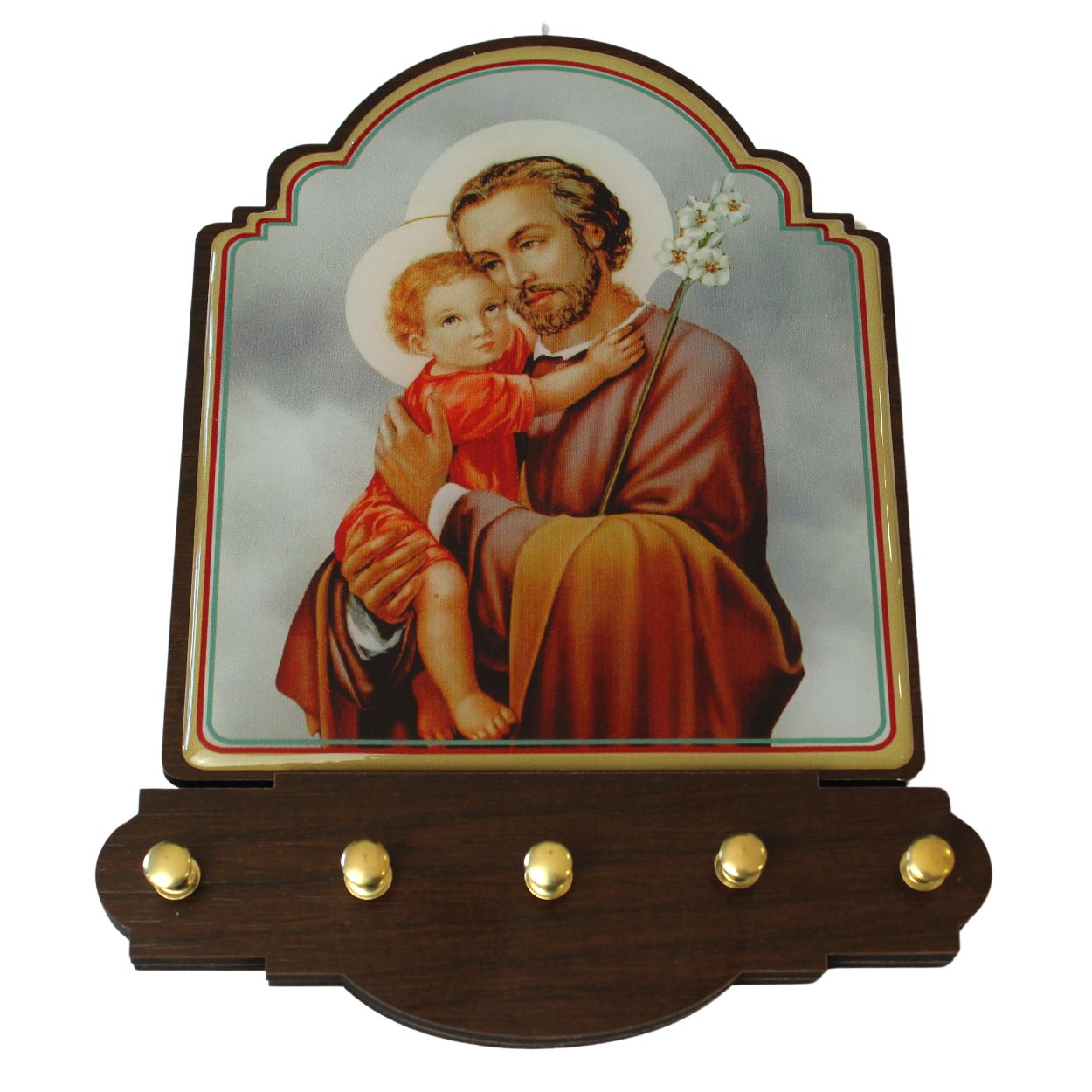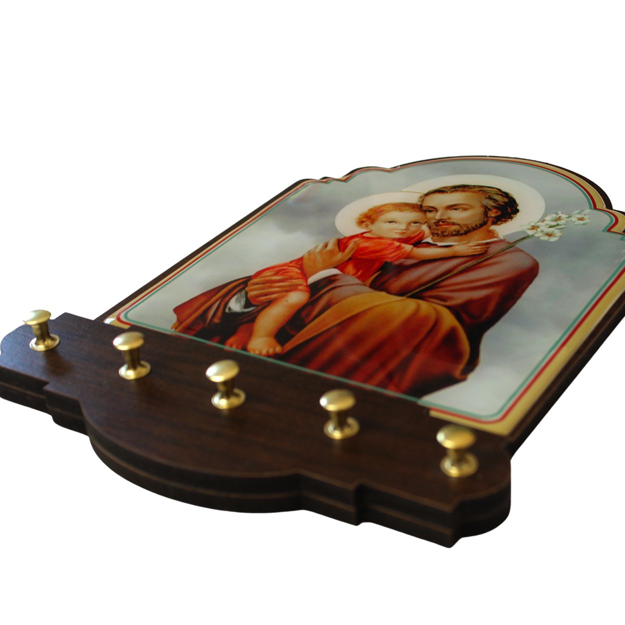 Porta chave produzido em MDF 6mm revestido Marrom, 5 pinos para colocação de chave, foto de São José, resinadas. Medindo aproximadamente 21cm de altura 16cm de largura e 2cm de comprimento. Fabricação própria.