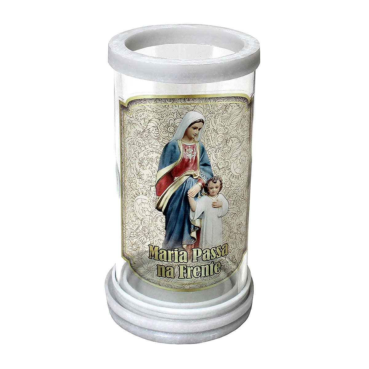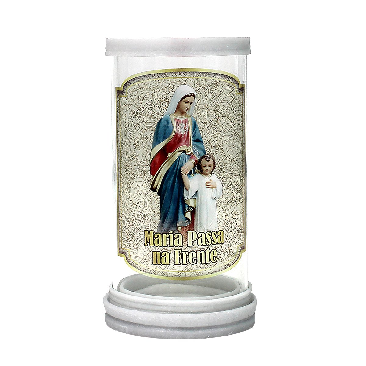 Porta vela produzido em vidro com aros de mármore, oferecendo um acabamento elegante e resistente. Ideal para compor oratórios, altares e ambientes devocionais, comportando velas com até 5,5 cm de diâmetro.