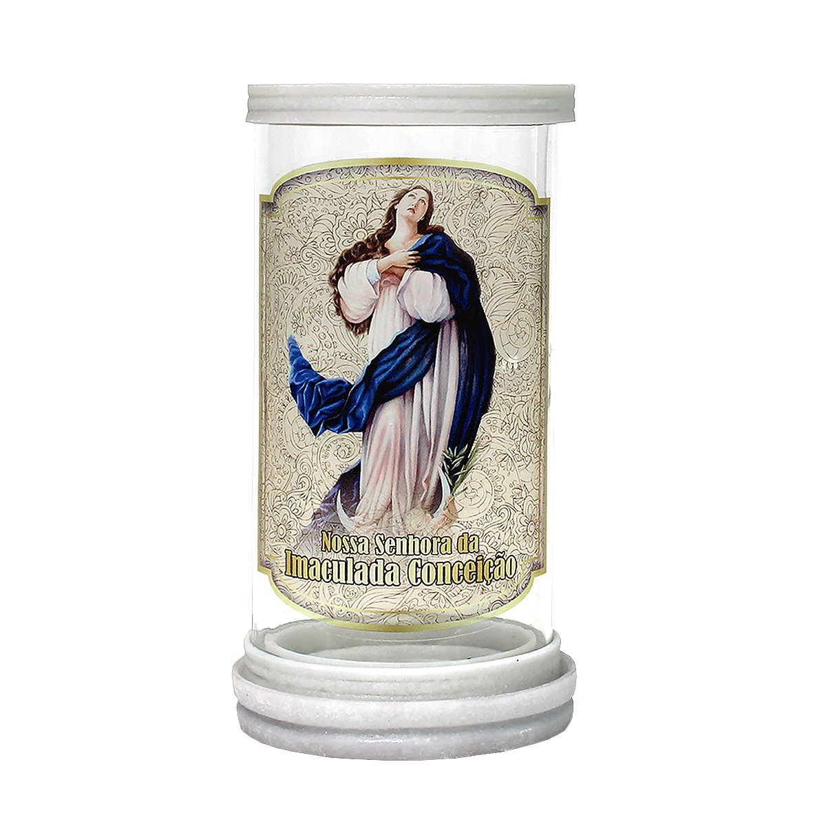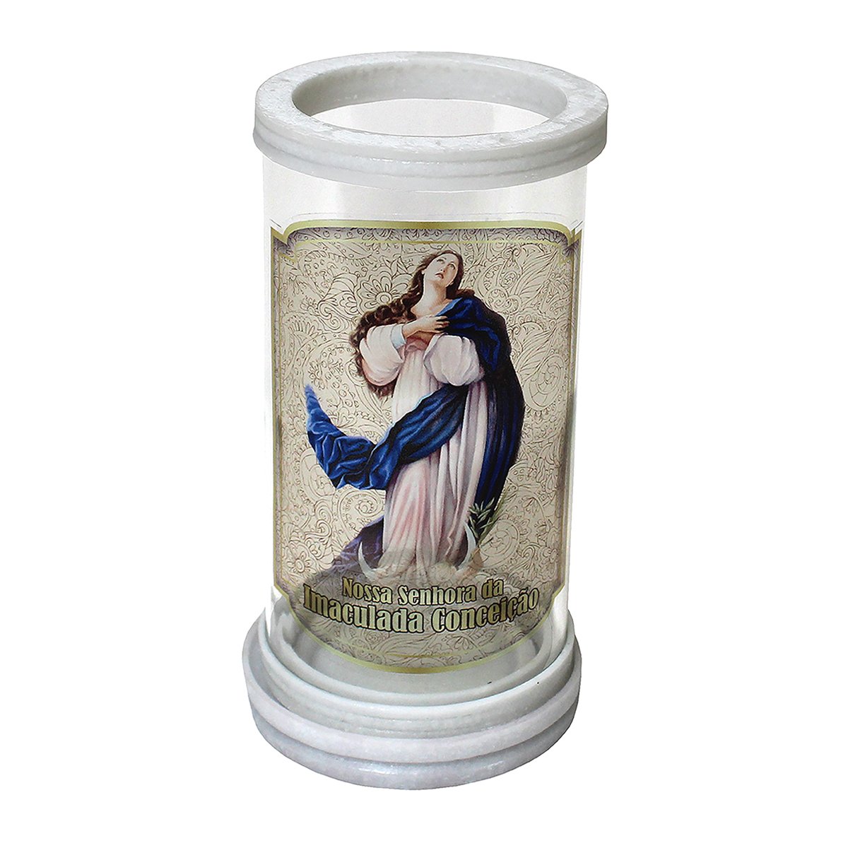Porta vela produzido em vidro com aros de mármore, oferecendo um acabamento elegante e resistente. Ideal para compor oratórios, altares e ambientes devocionais, comportando velas com até 5,5 cm de diâmetro.