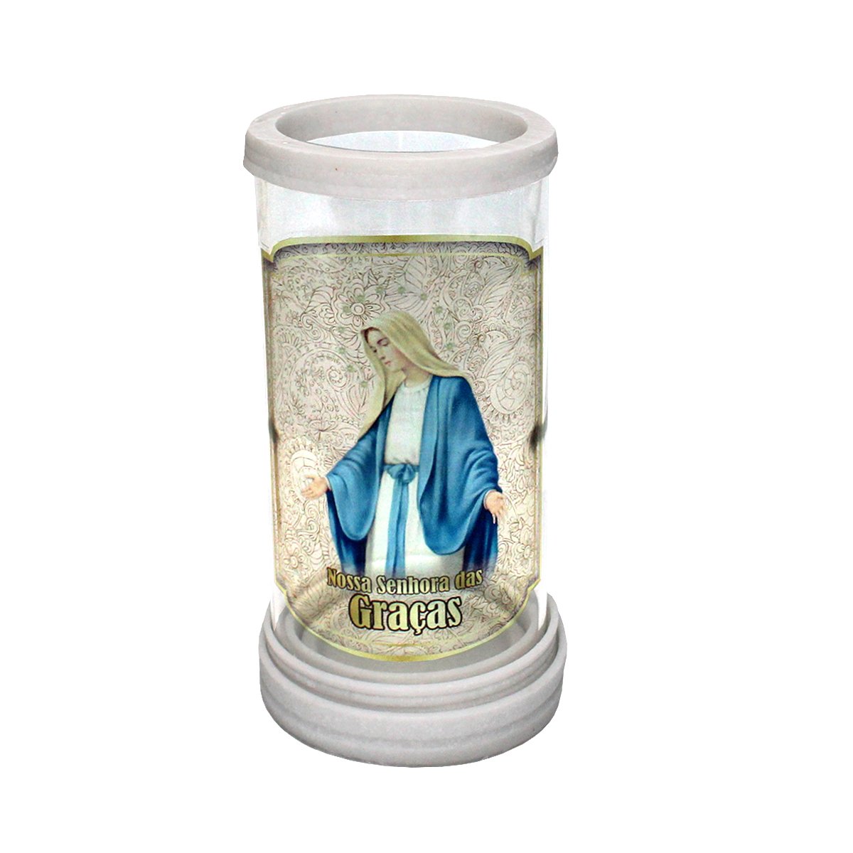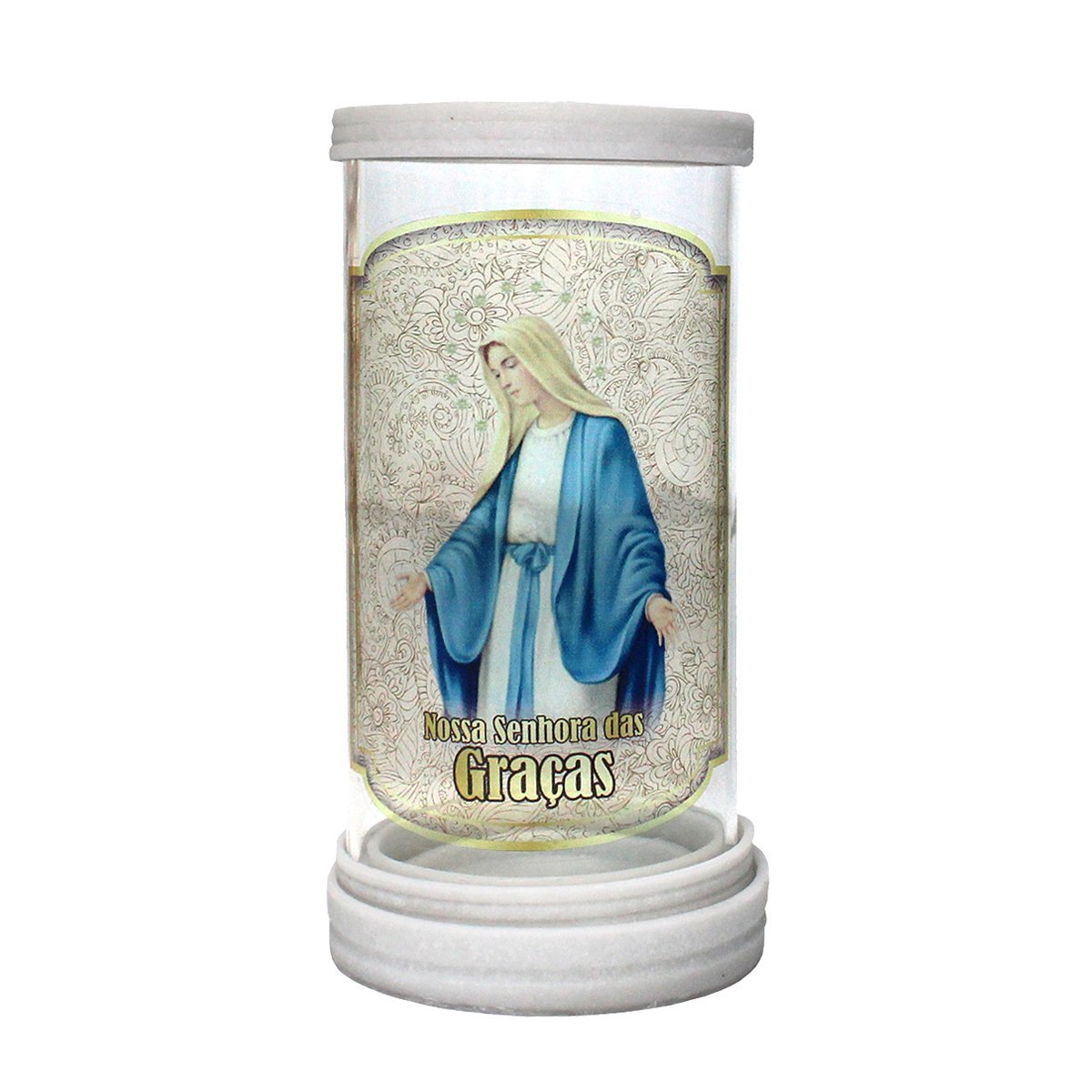 Porta vela produzido em vidro com aros de mármore, oferecendo um acabamento elegante e resistente. Ideal para compor oratórios, altares e ambientes devocionais, comportando velas com até 5,5 cm de diâmetro.
