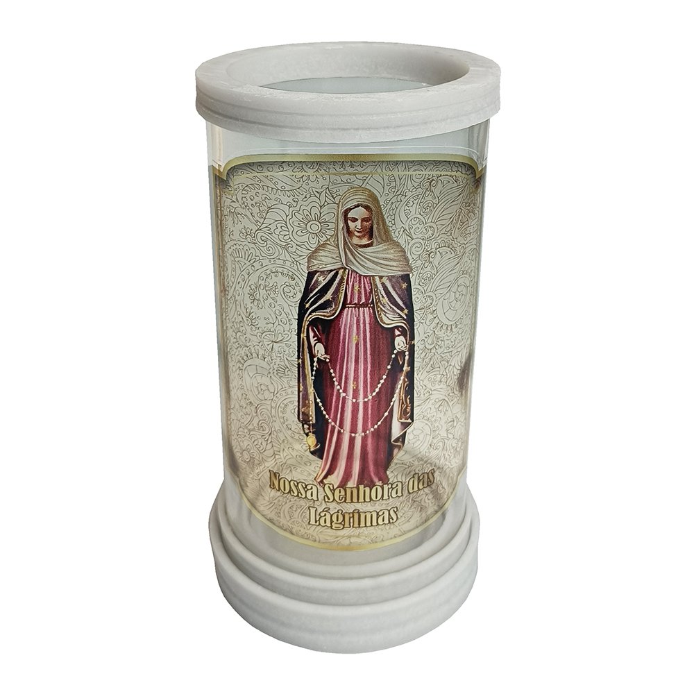 Porta vela produzido em vidro com aros de mármore, oferecendo um acabamento elegante e resistente. Ideal para compor oratórios, altares e ambientes devocionais, comportando velas com até 5,5 cm de diâmetro.