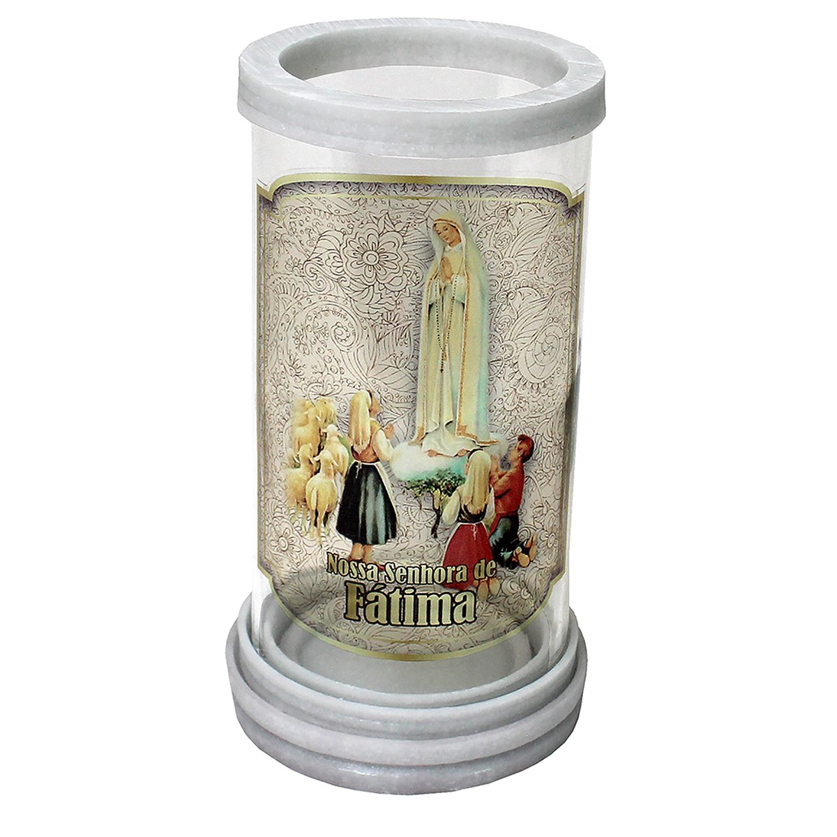 Porta vela produzido em vidro com aros de mármore, oferecendo um acabamento elegante e resistente. Ideal para compor oratórios, altares e ambientes devocionais, comportando velas com até 5,5 cm de diâmetro.