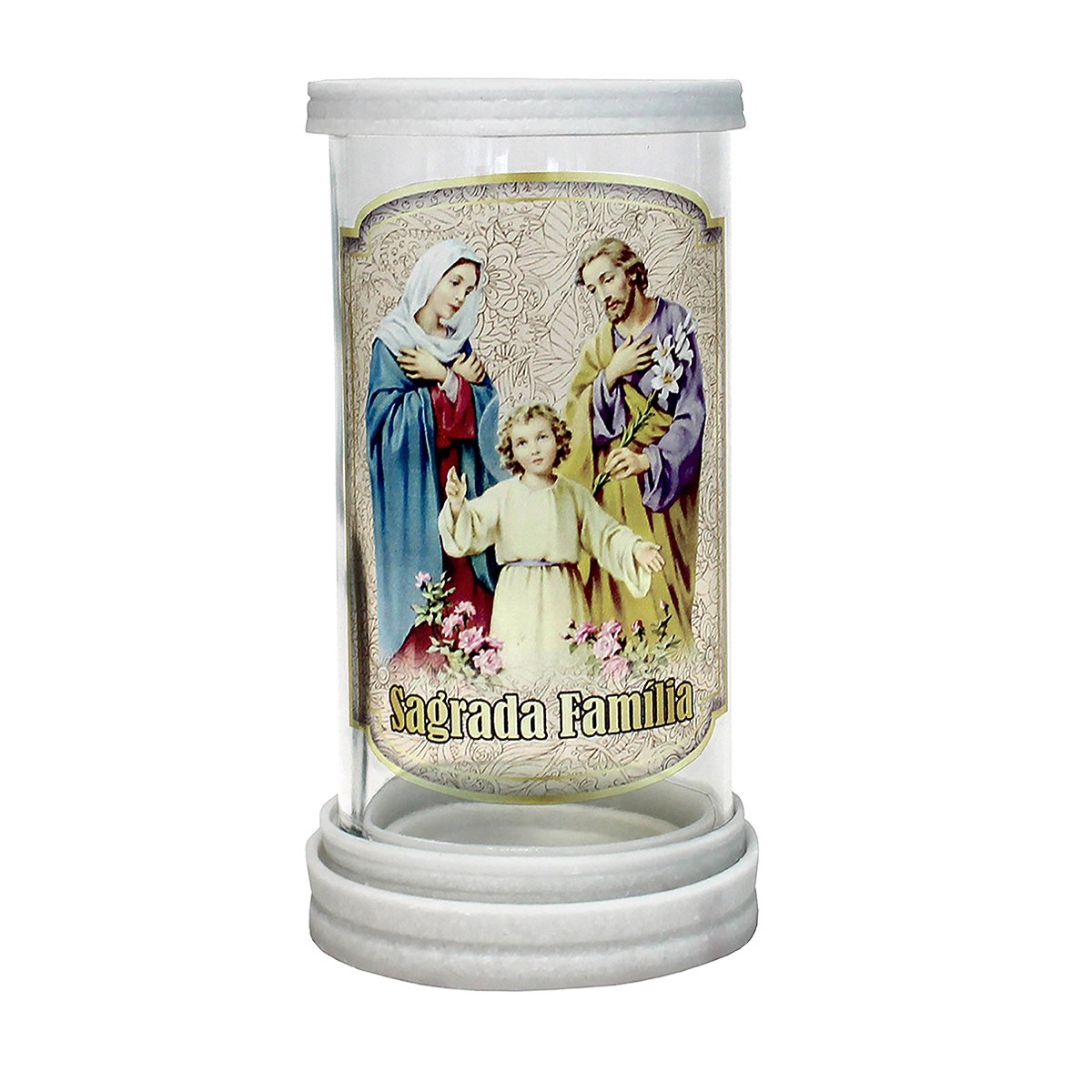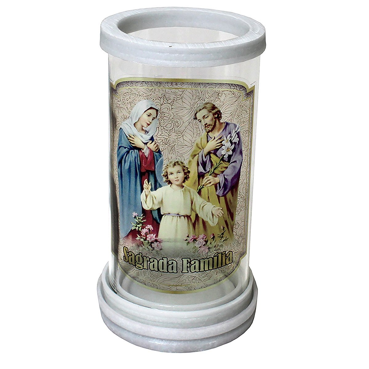 Porta vela produzido em vidro com aros de mármore, oferecendo um acabamento elegante e resistente. Ideal para compor oratórios, altares e ambientes devocionais, comportando velas com até 5,5 cm de diâmetro.