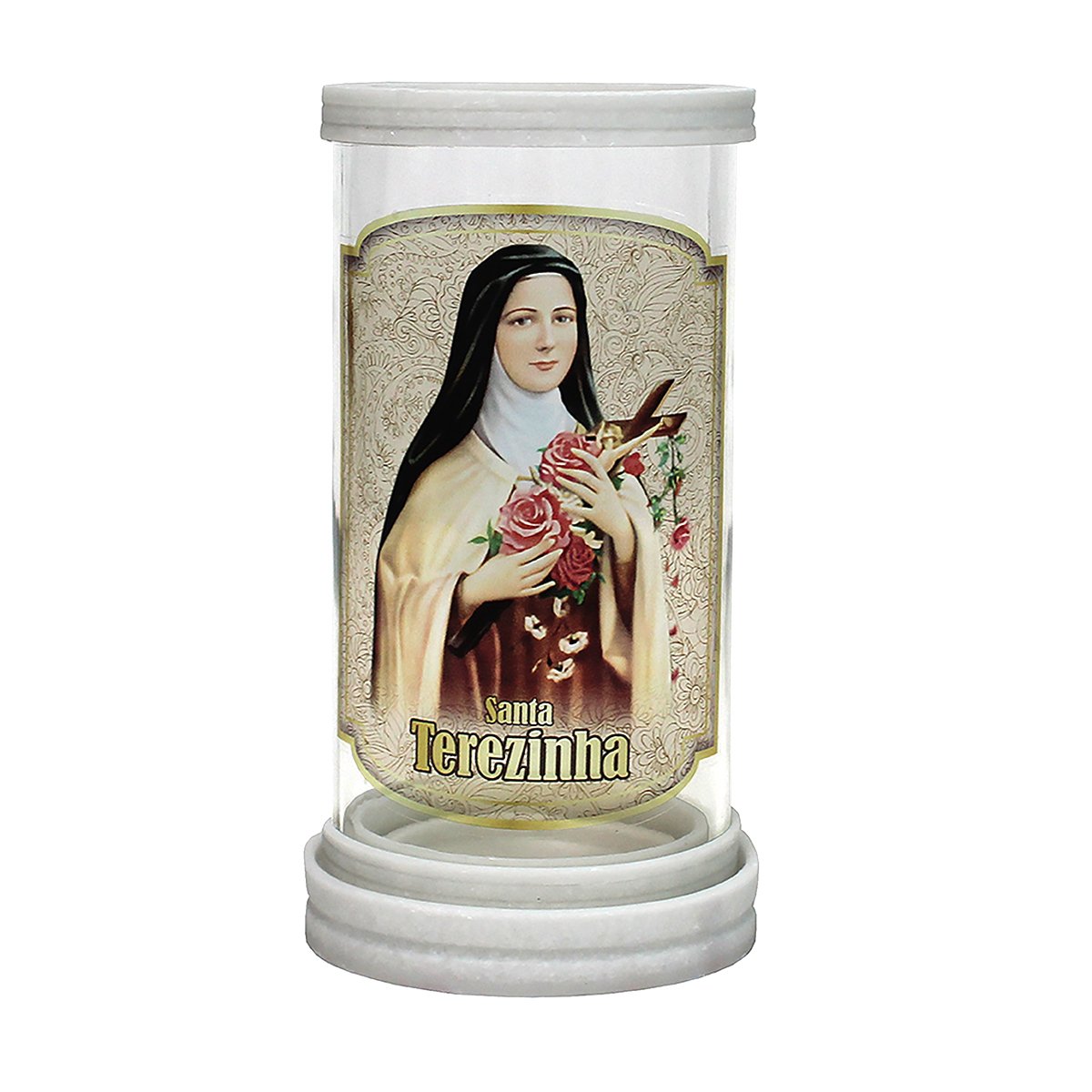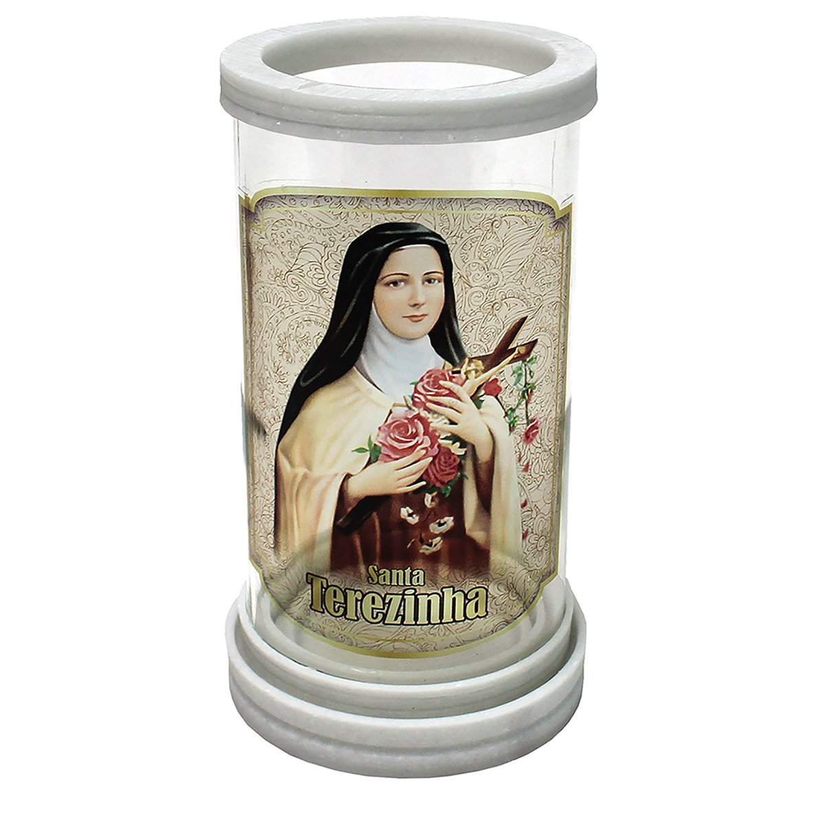 Porta vela produzido em vidro com aros de mármore, oferecendo um acabamento elegante e resistente. Ideal para compor oratórios, altares e ambientes devocionais, comportando velas com até 5,5 cm de diâmetro.