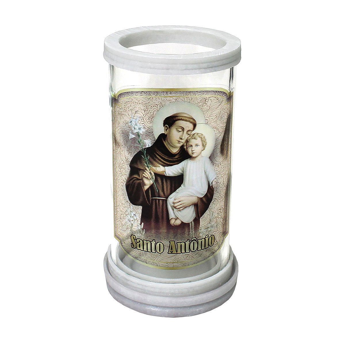 Porta vela produzido em vidro com aros de mármore, oferecendo um acabamento elegante e resistente. Ideal para compor oratórios, altares e ambientes devocionais, comportando velas com até 5,5 cm de diâmetro.