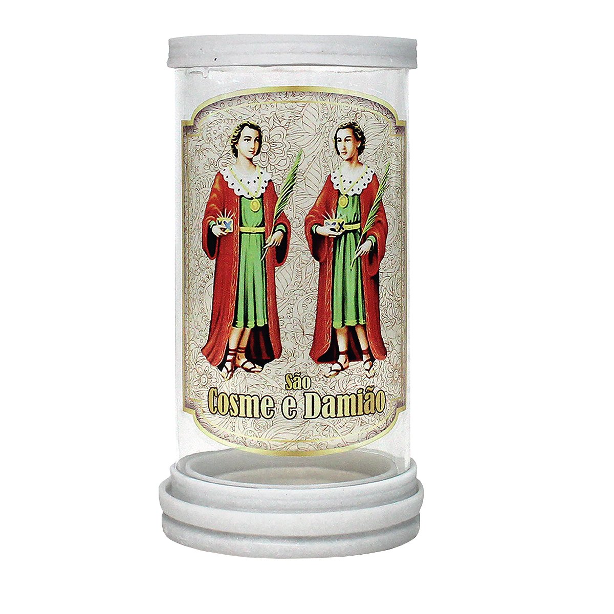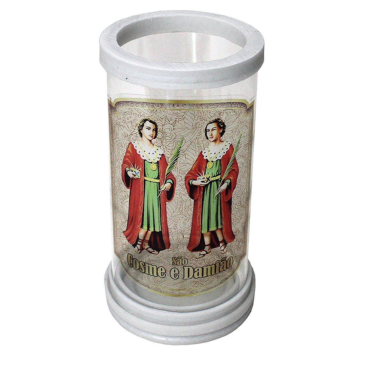 Porta vela produzido em vidro com aros de mármore, oferecendo um acabamento elegante e resistente. Ideal para compor oratórios, altares e ambientes devocionais, comportando velas com até 5,5 cm de diâmetro.