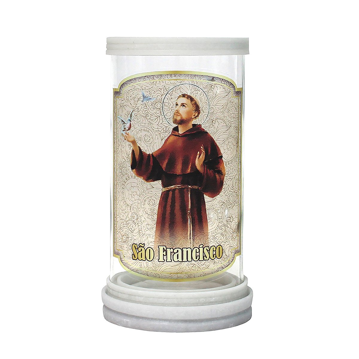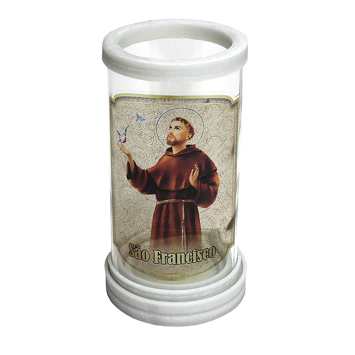 Porta vela produzido em vidro com aros de mármore, oferecendo um acabamento elegante e resistente. Ideal para compor oratórios, altares e ambientes devocionais, comportando velas com até 5,5 cm de diâmetro.