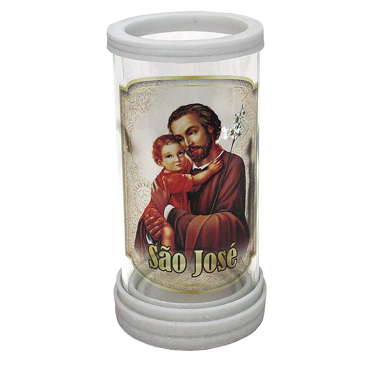 Porta vela produzido em vidro com aros de mármore, oferecendo um acabamento elegante e resistente. Ideal para compor oratórios, altares e ambientes devocionais, comportando velas com até 5,5 cm de diâmetro.