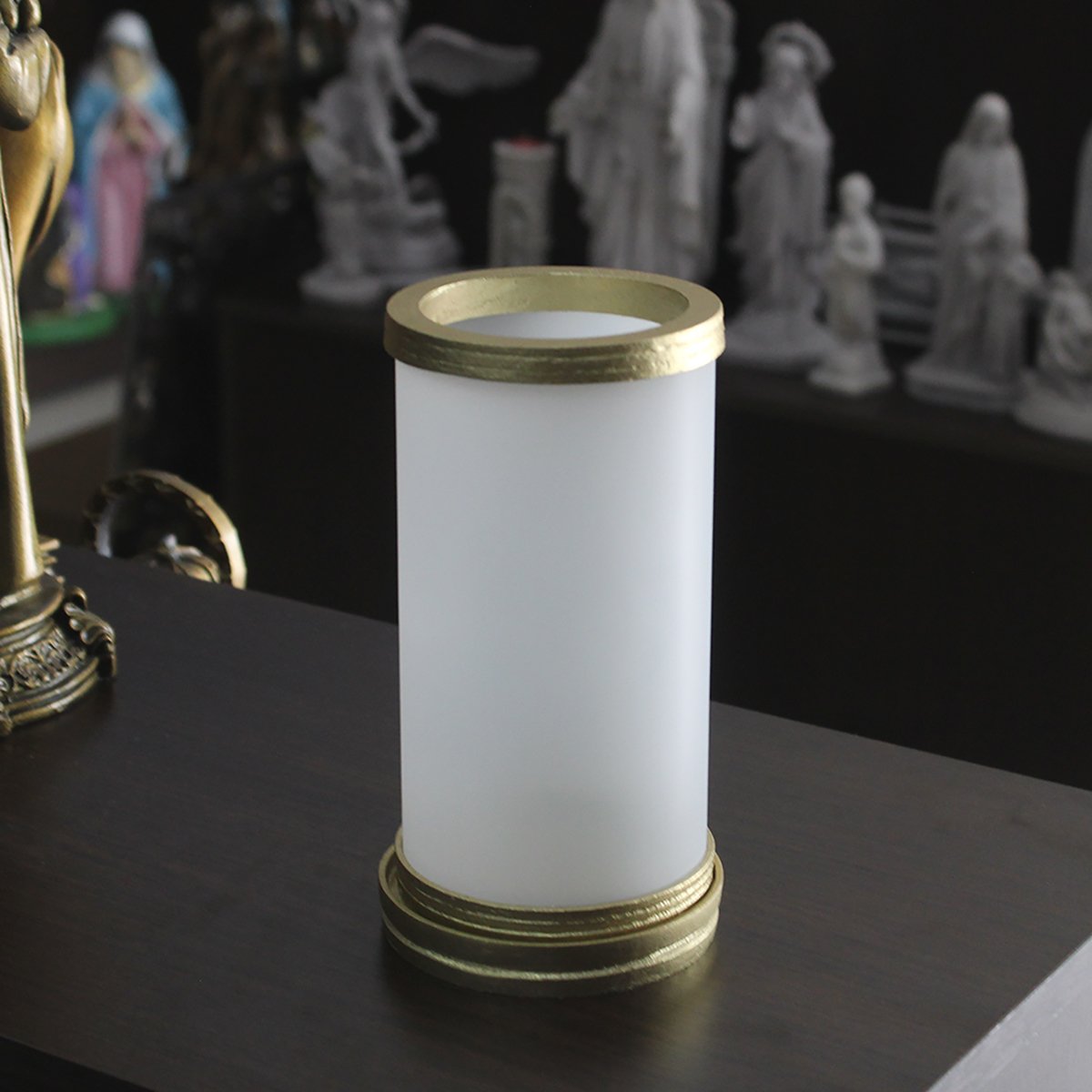 Porta vela produzido em vidro jateado com aros de mármore com pintura em dourado, oferecendo um acabamento elegante e resistente. Ideal para compor oratórios, altares e ambientes devocionais, comportando velas com até 5,5 cm de diâmetro.