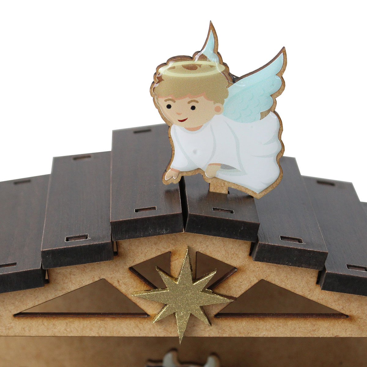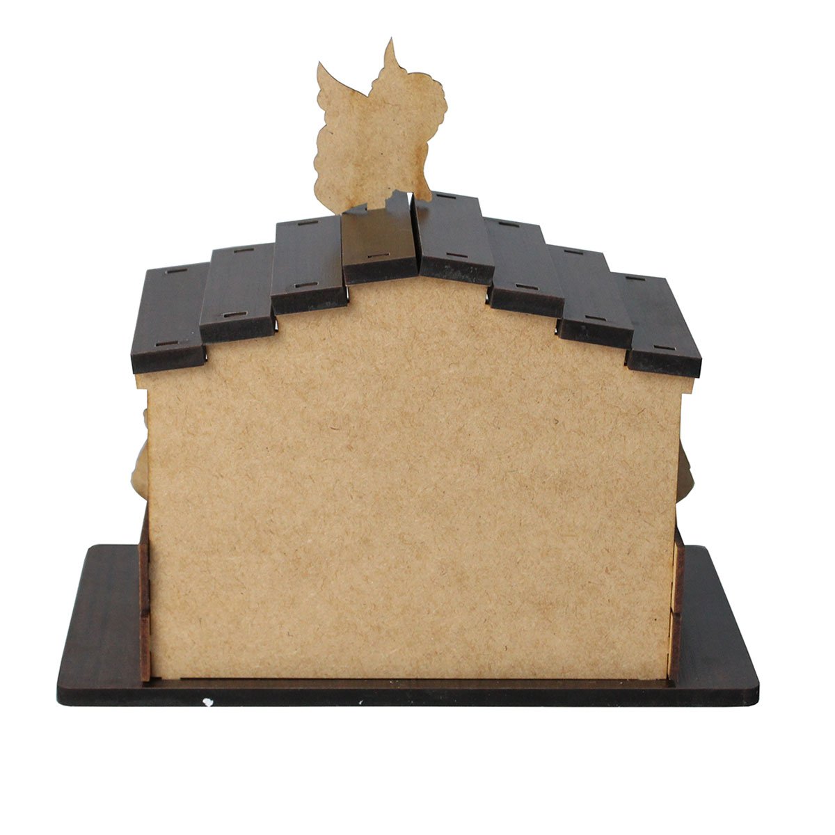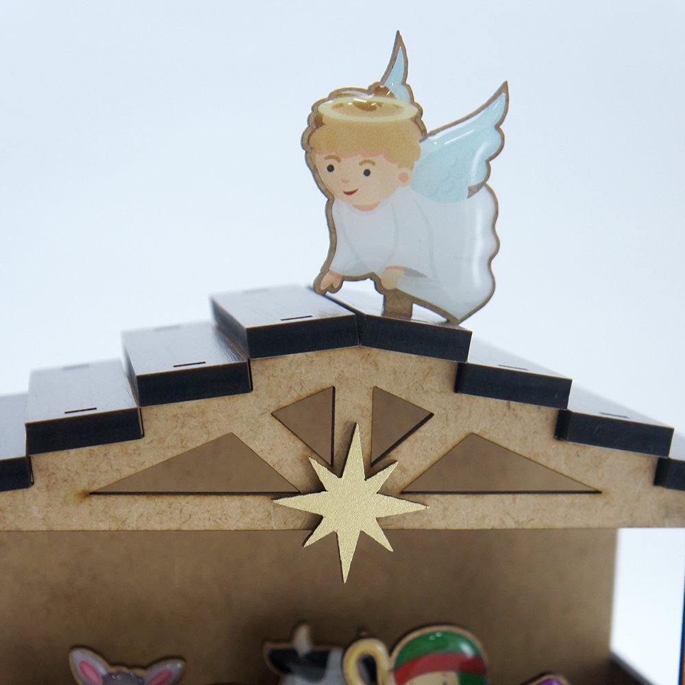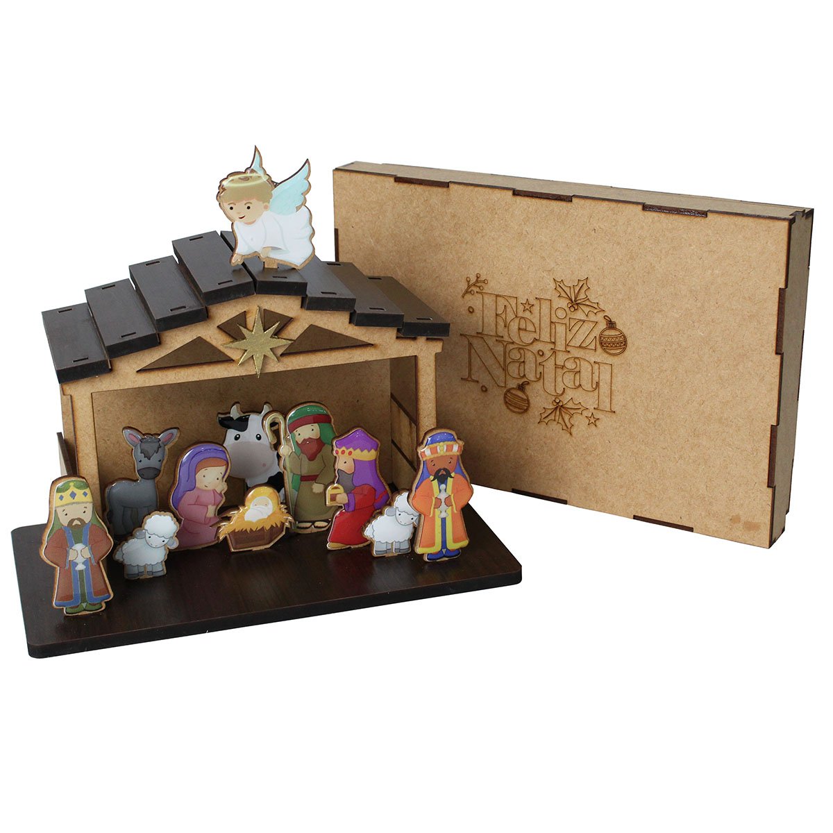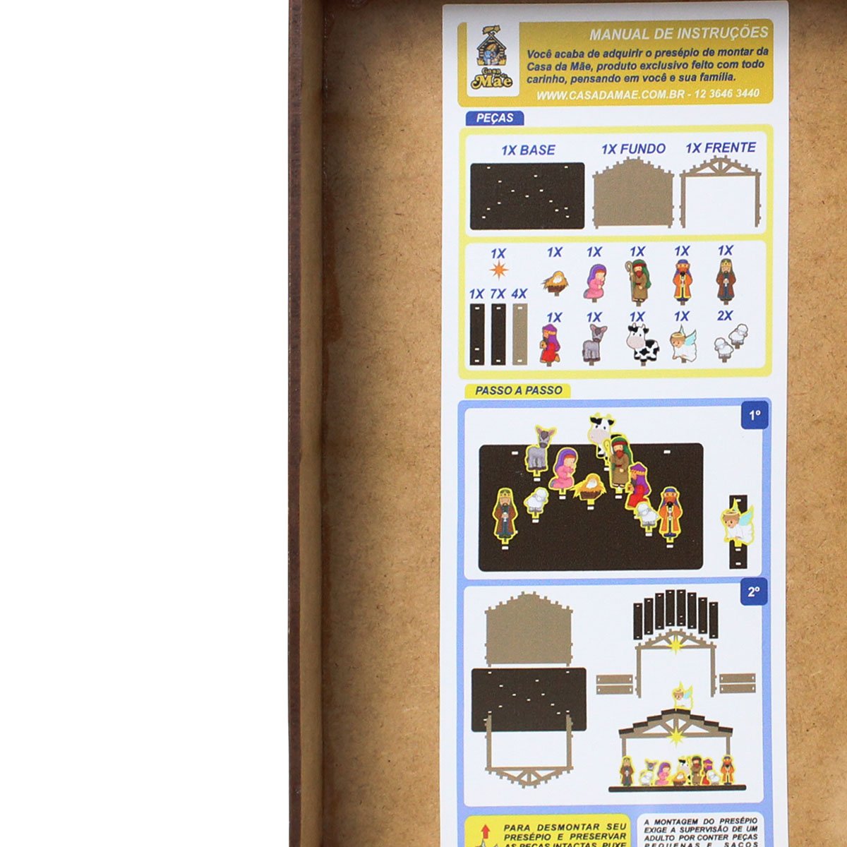 Presépio produzido em MDF com adesivo resinado, são 11 peças cada uma com seu respectivo local de fixação. Acompanha uma caixa em MDF com manual de instruções de montagem.