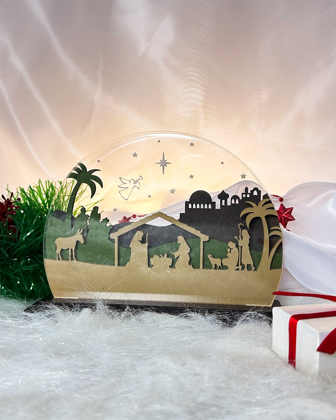 Observação: Este presépio é enviado desmontado, garantindo praticidade no transporte e segurança durante o envio. A peça em acrílico acompanha uma película protetora contra arranhões, que pode ser removida facilmente antes do uso, preservando o brilho e a transparência do material.
