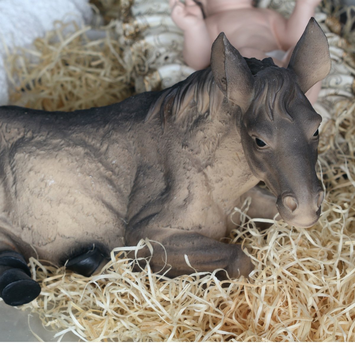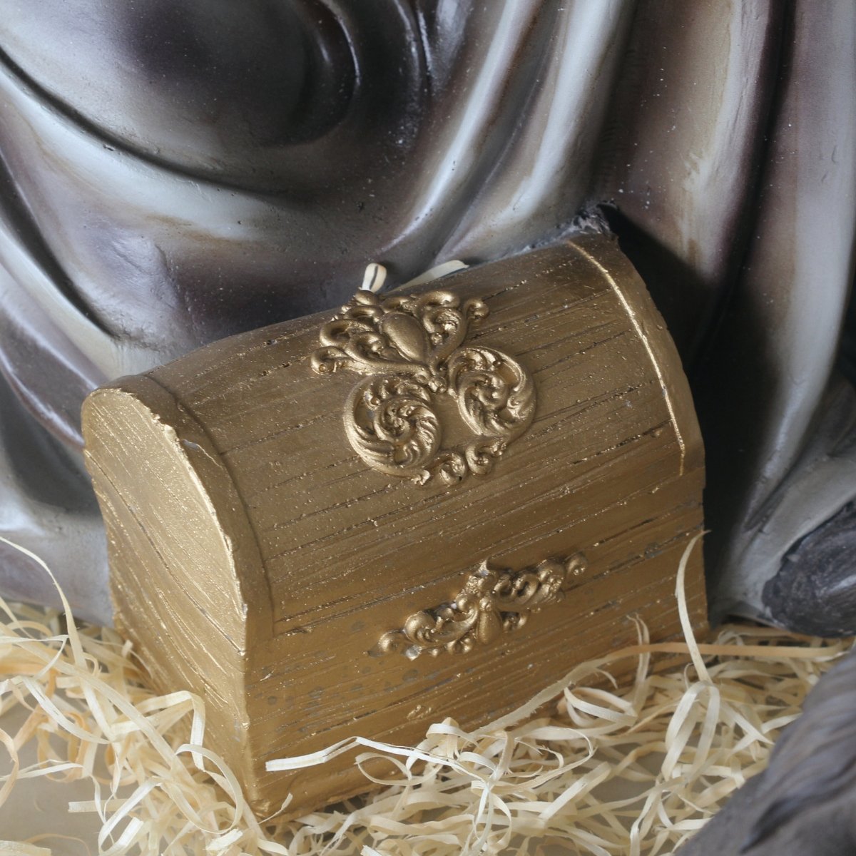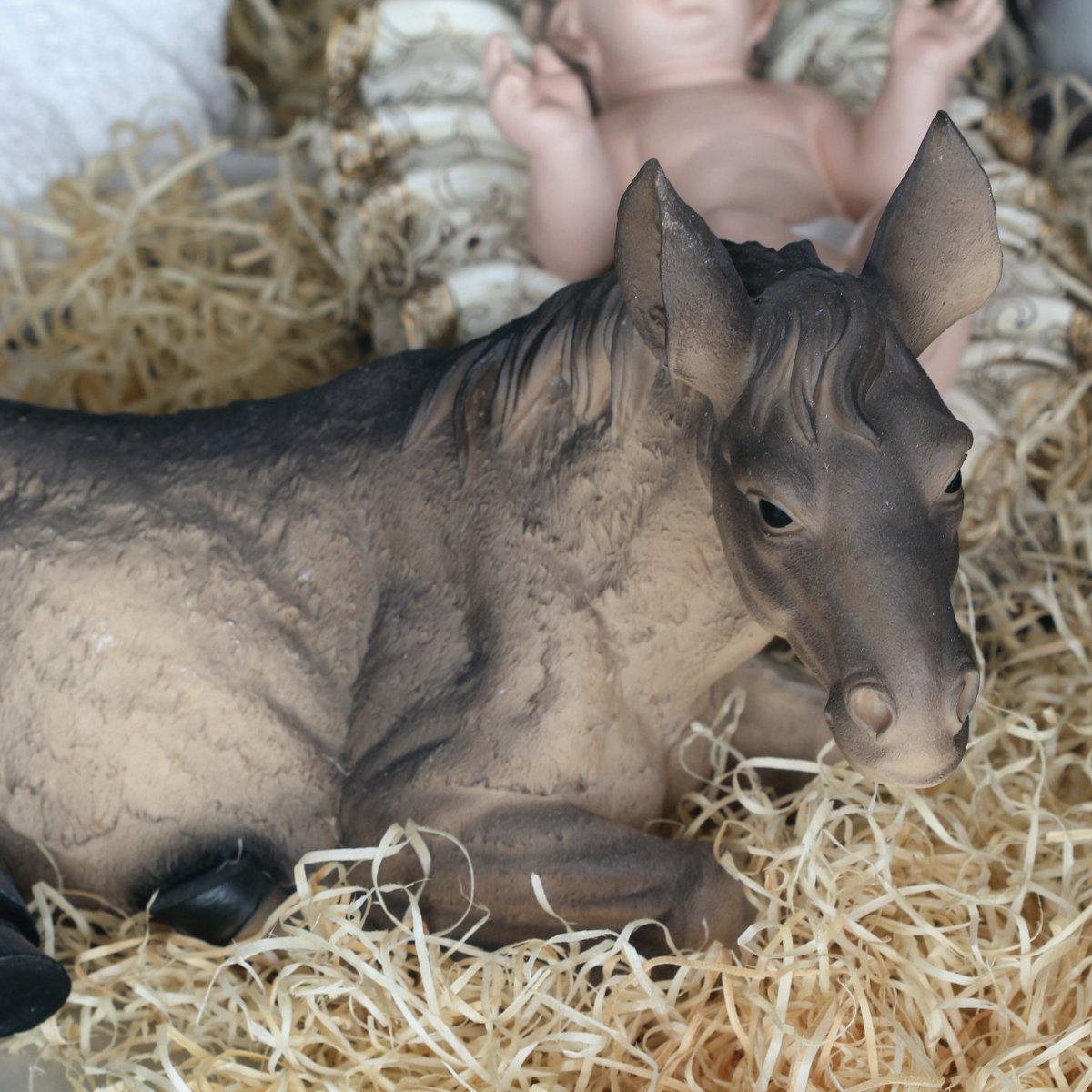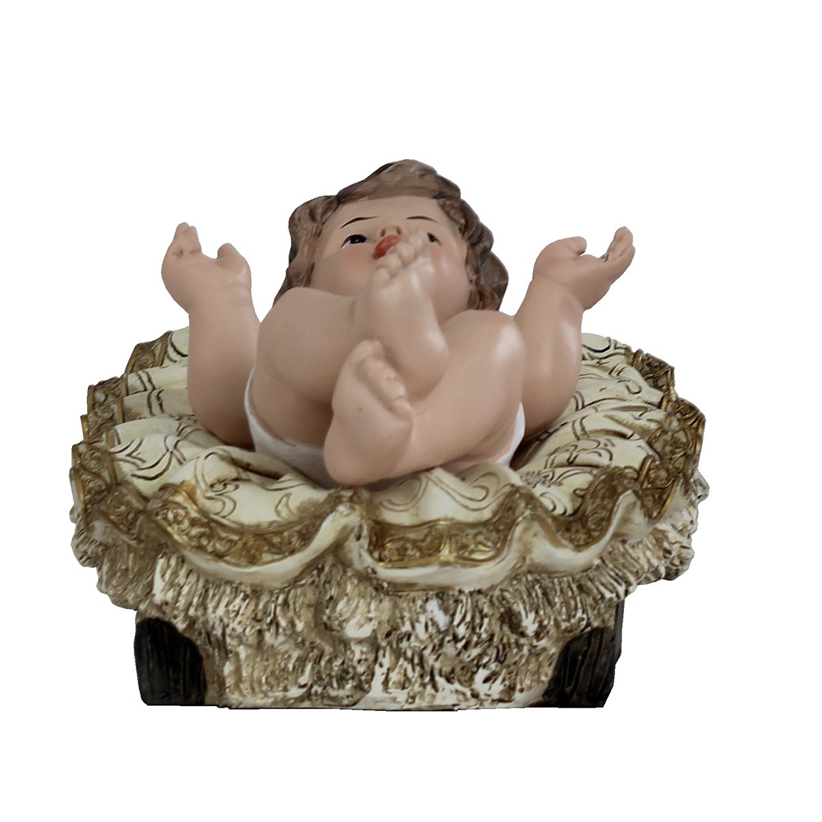 Manjedoura com menino Jesus: 16 cm de altura, 22 cm de largura e 32 cm de comprimento.