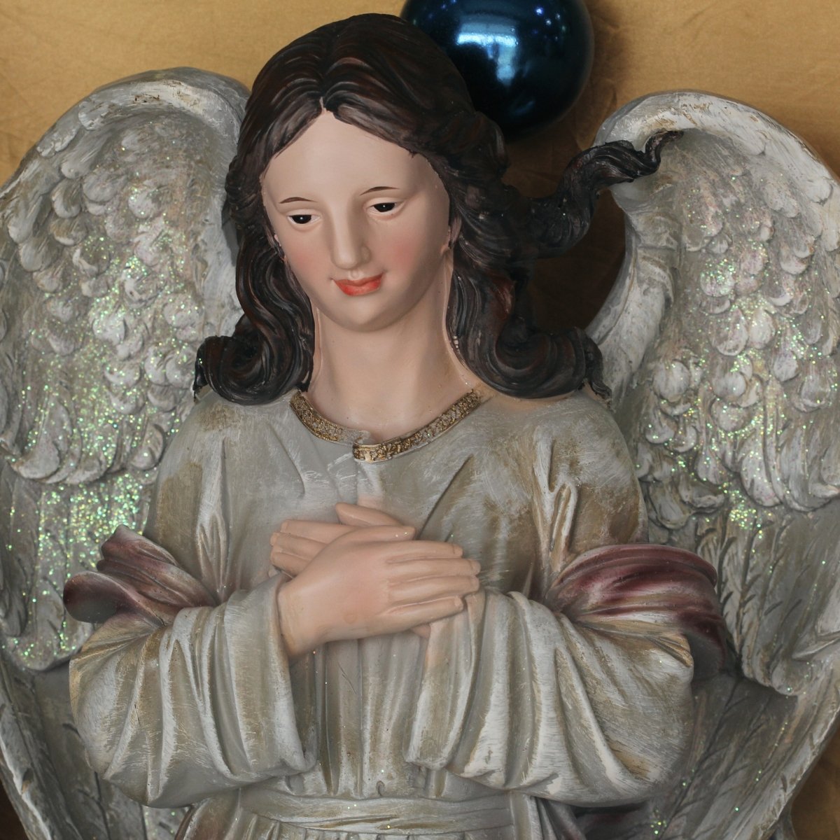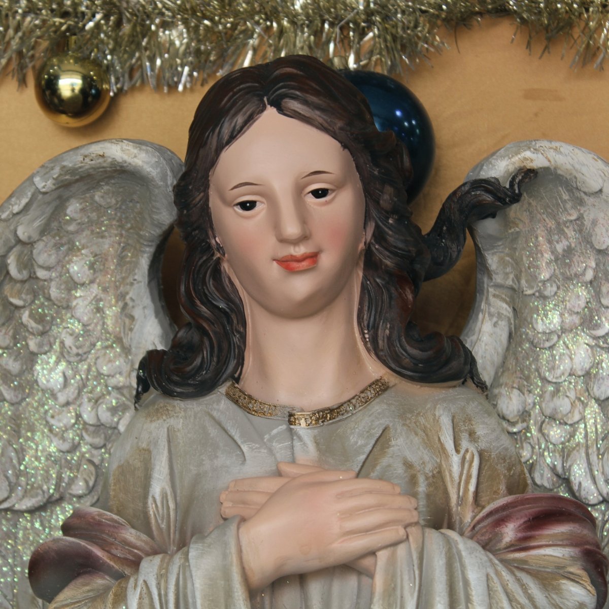 Anjo: 86 cm de altura, 40 cm de largura e 28 cm de comprimento.