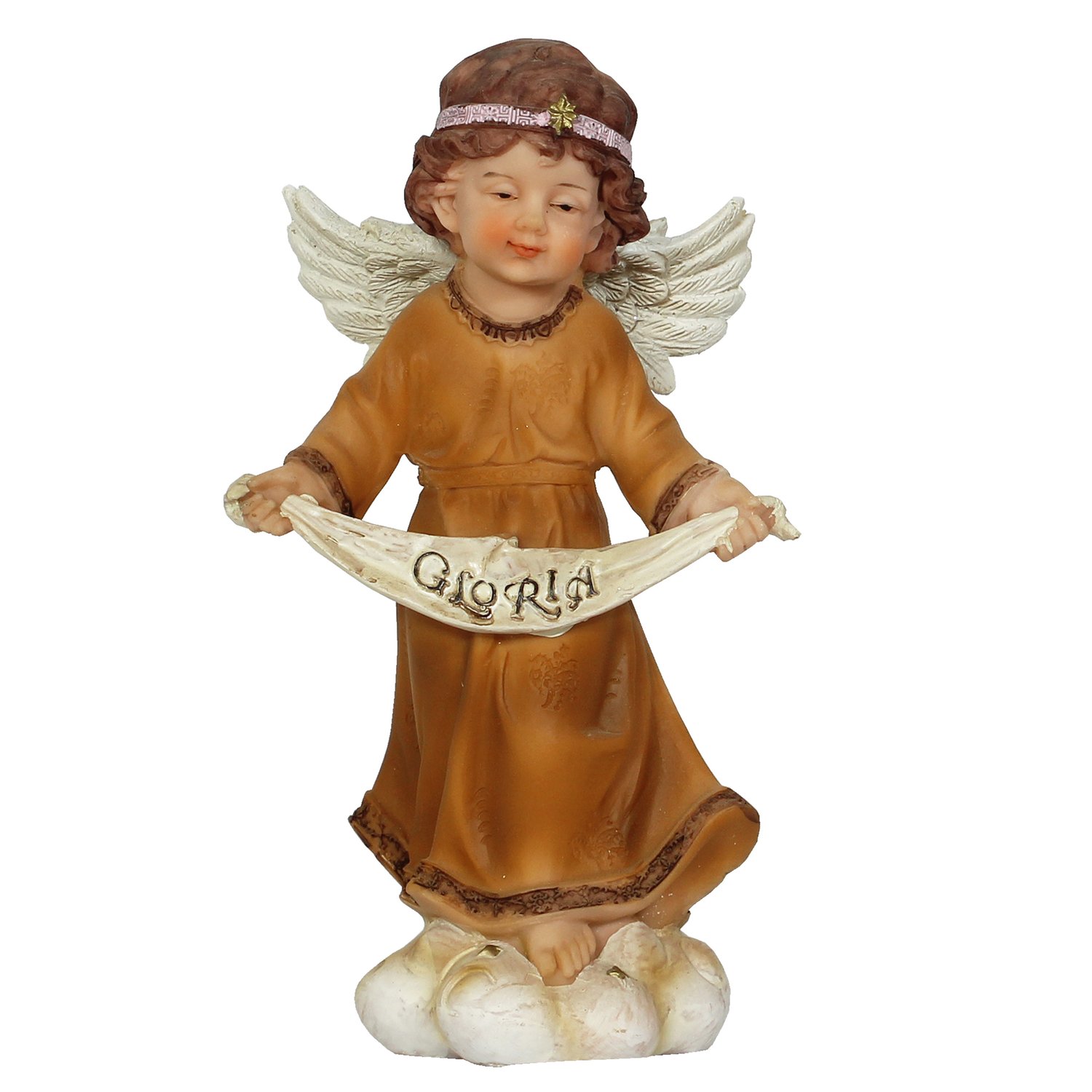 Anjo: 20 cm de altura, 11 cm de largura e 7,5 cm de comprimento.