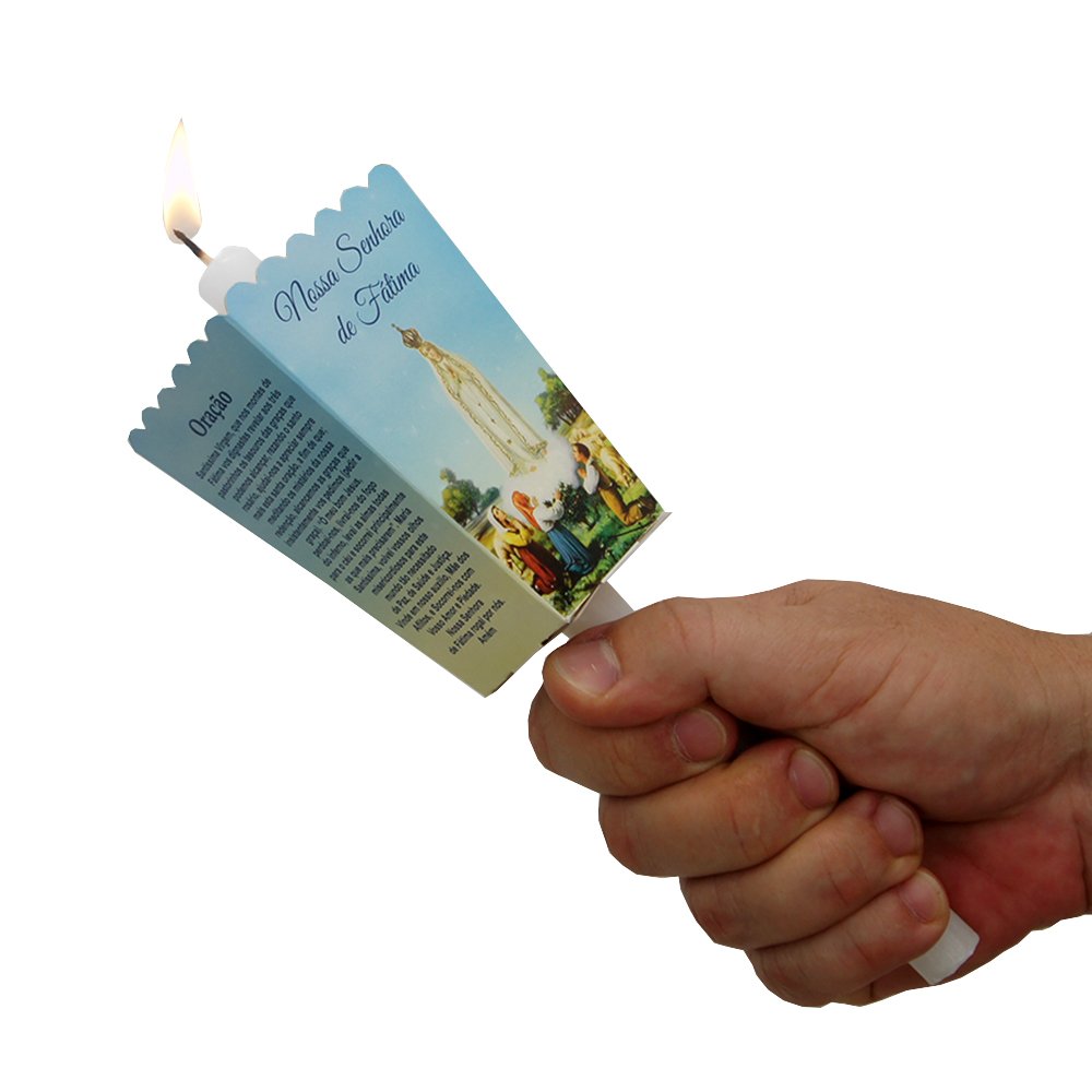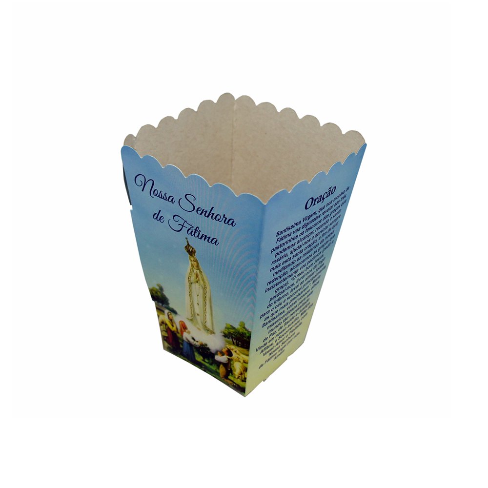Protetor para vela de procissão Nossa Senhora de Fátima com Pastorinhos, cobertura anti-chama, papel couchê, cachepô montaado mede aproximadamente 10cm de altura. O produto vem desmontado para transporte, encaixe fácil de ser montado.