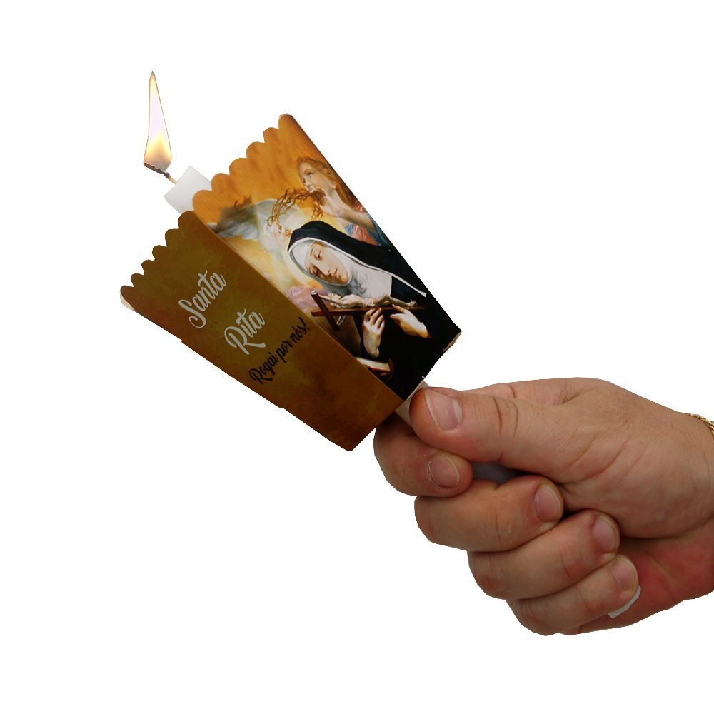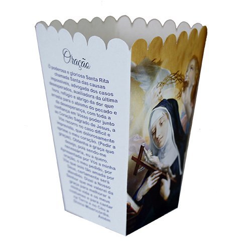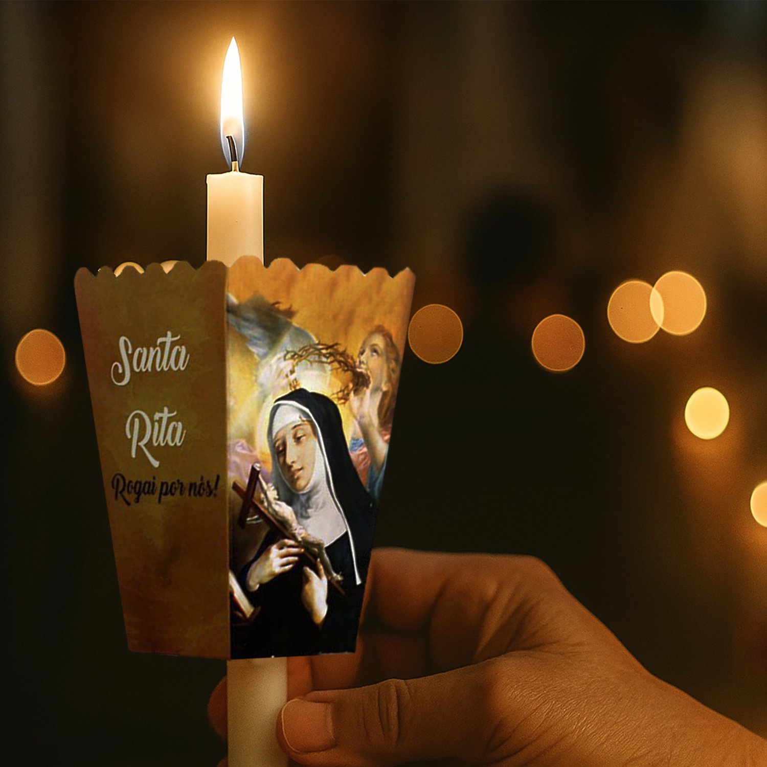 Protetor para vela de procissão de Santa Rita, cobertura anti-chama, papel couchê, cachepô montaado mede aproximadamente 10cm de altua. O produto vem desmontado para transporte, encaixe fácil de ser montado.