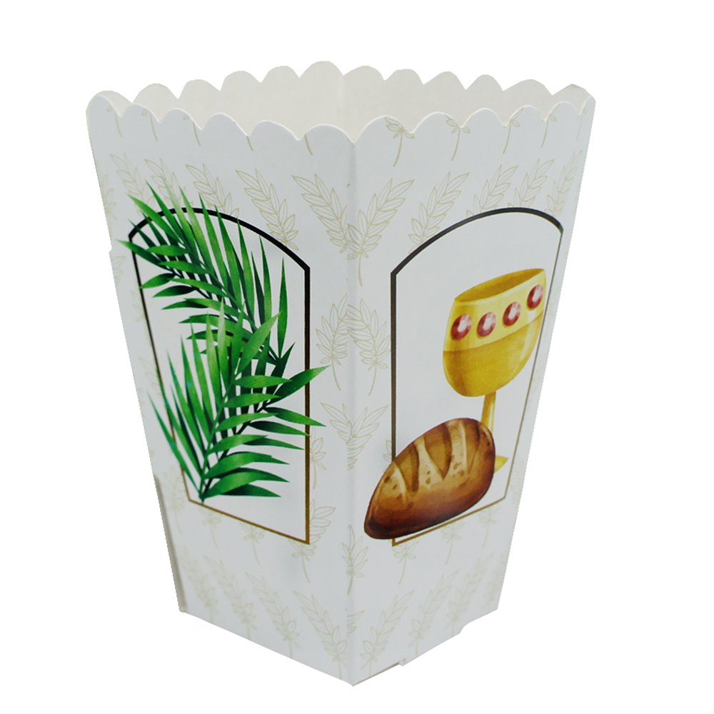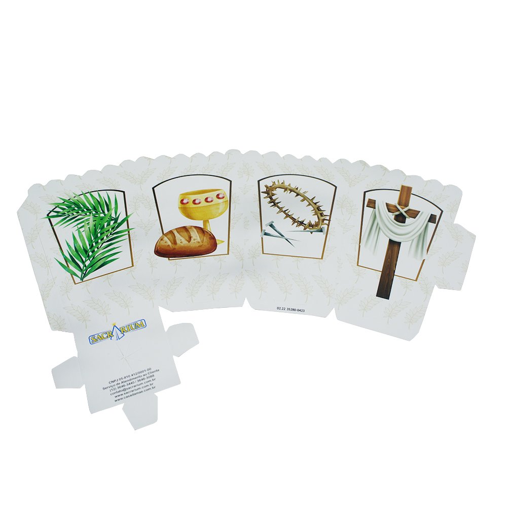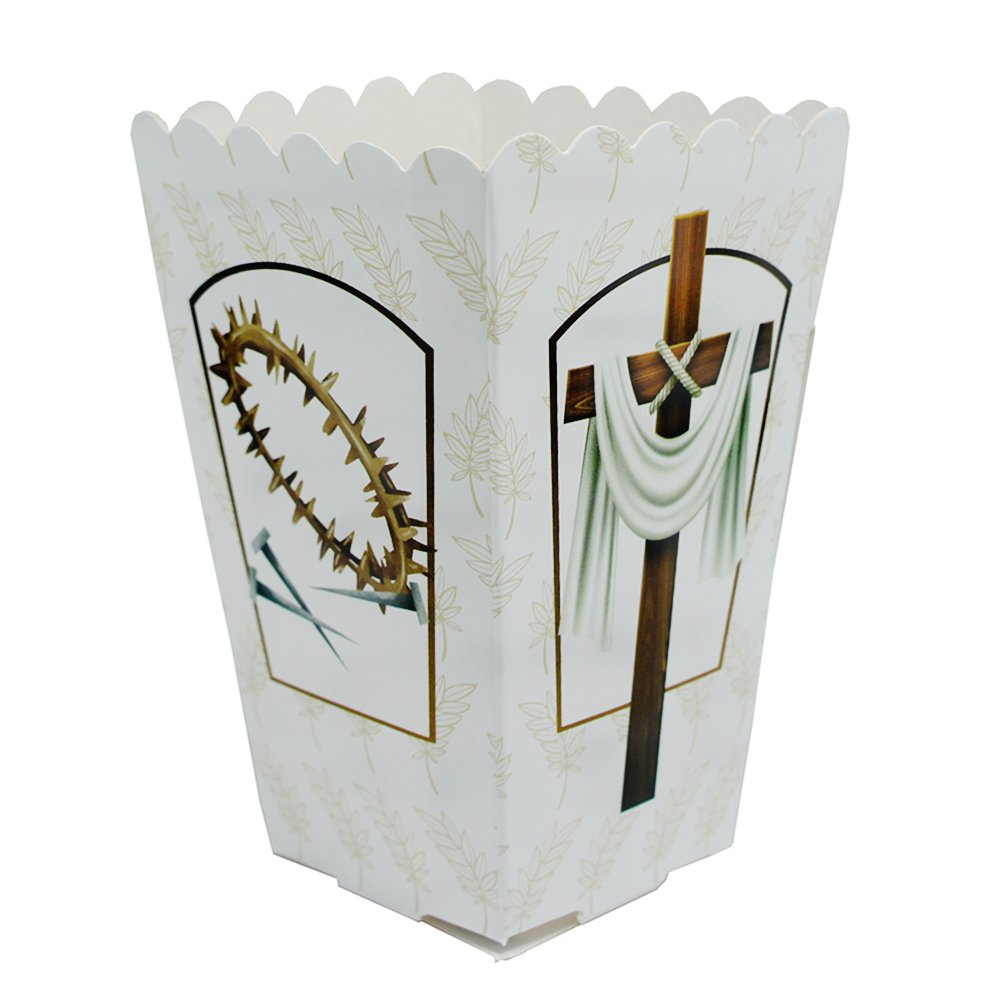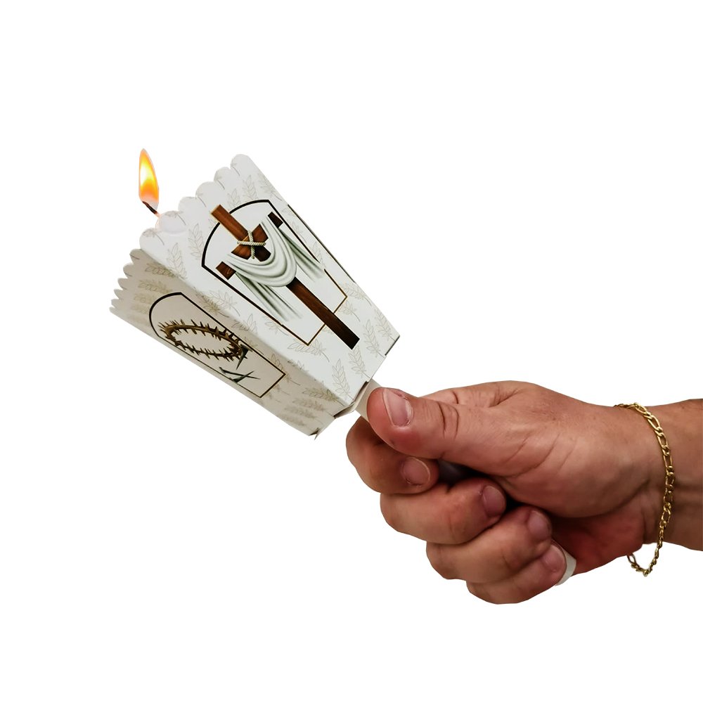 Protetor para vela de procissão na cor branca no tema da Semana Santa, cobertura anti-chama, papel couchê, cachepô montaado mede aproximadamente 10cm de altua. O produto vem desmontado para transporte, encaixe fácil de ser montado.