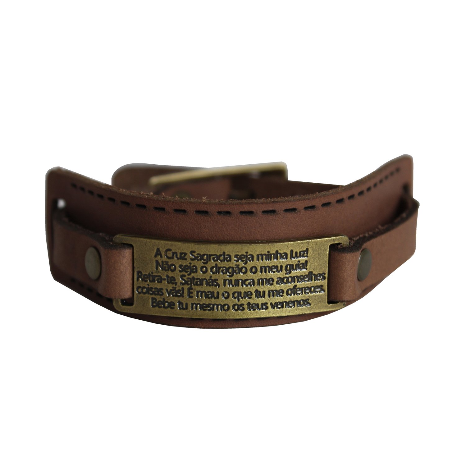 Pulseira Couro Marrom Oração São Bento Ouro Velho