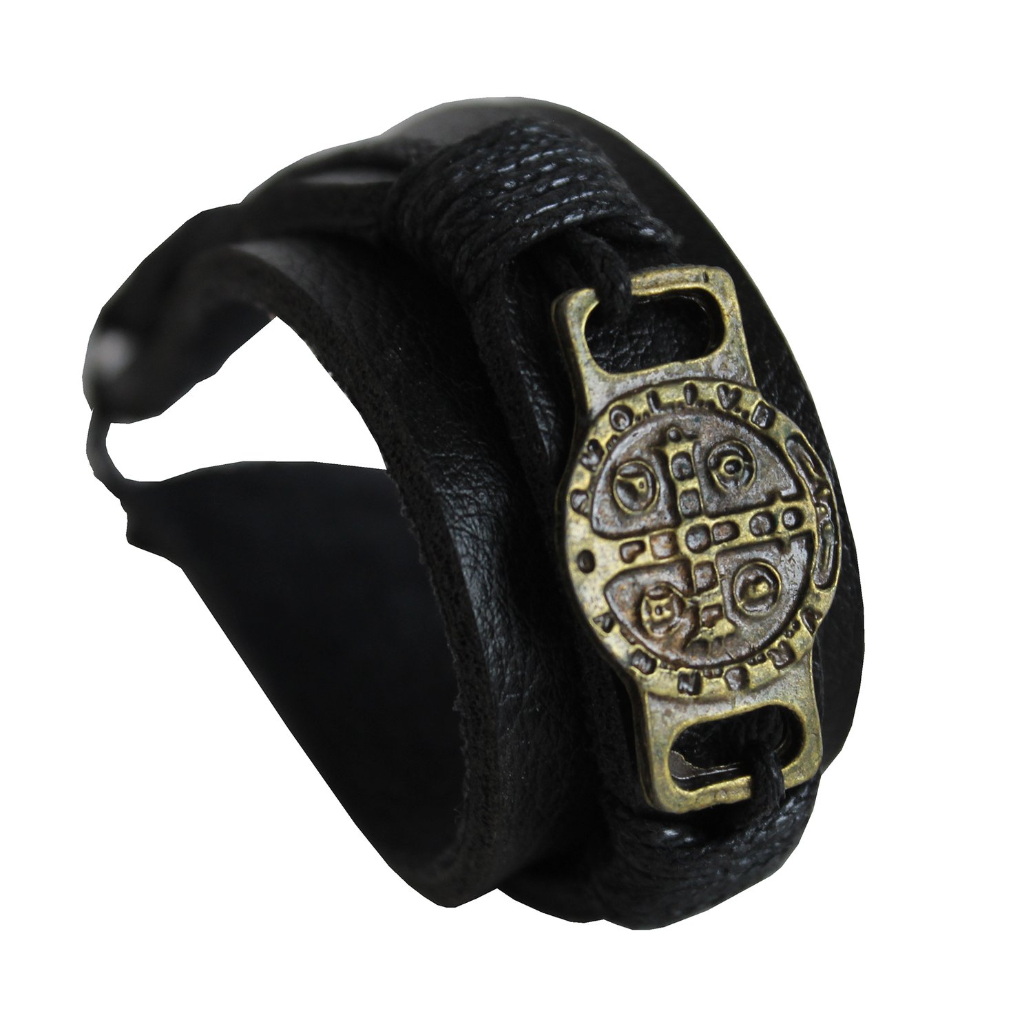 Pulseira São bento em bronze envelhecido, couro preto.