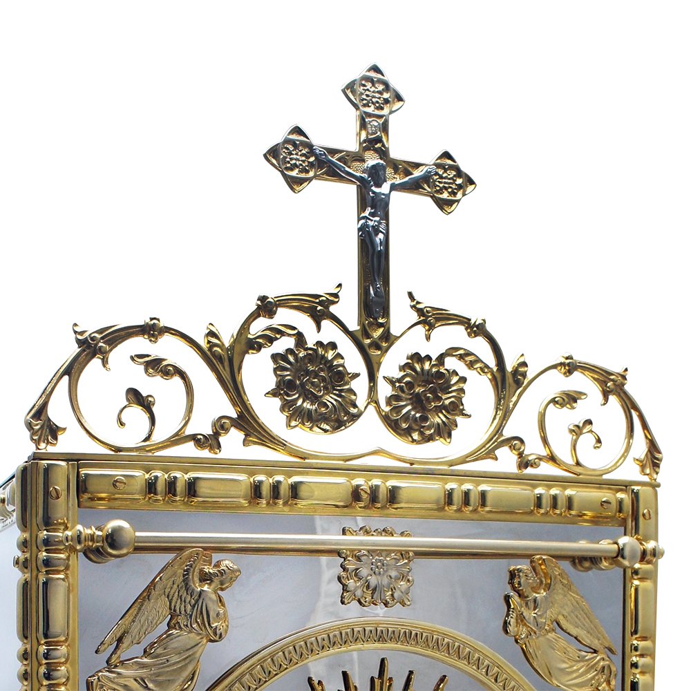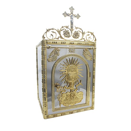 Sacrário de mesa espelhado com detalhes em alto relevo na porta e adornado por todo seu entorno. Acompanha um par de chaves.