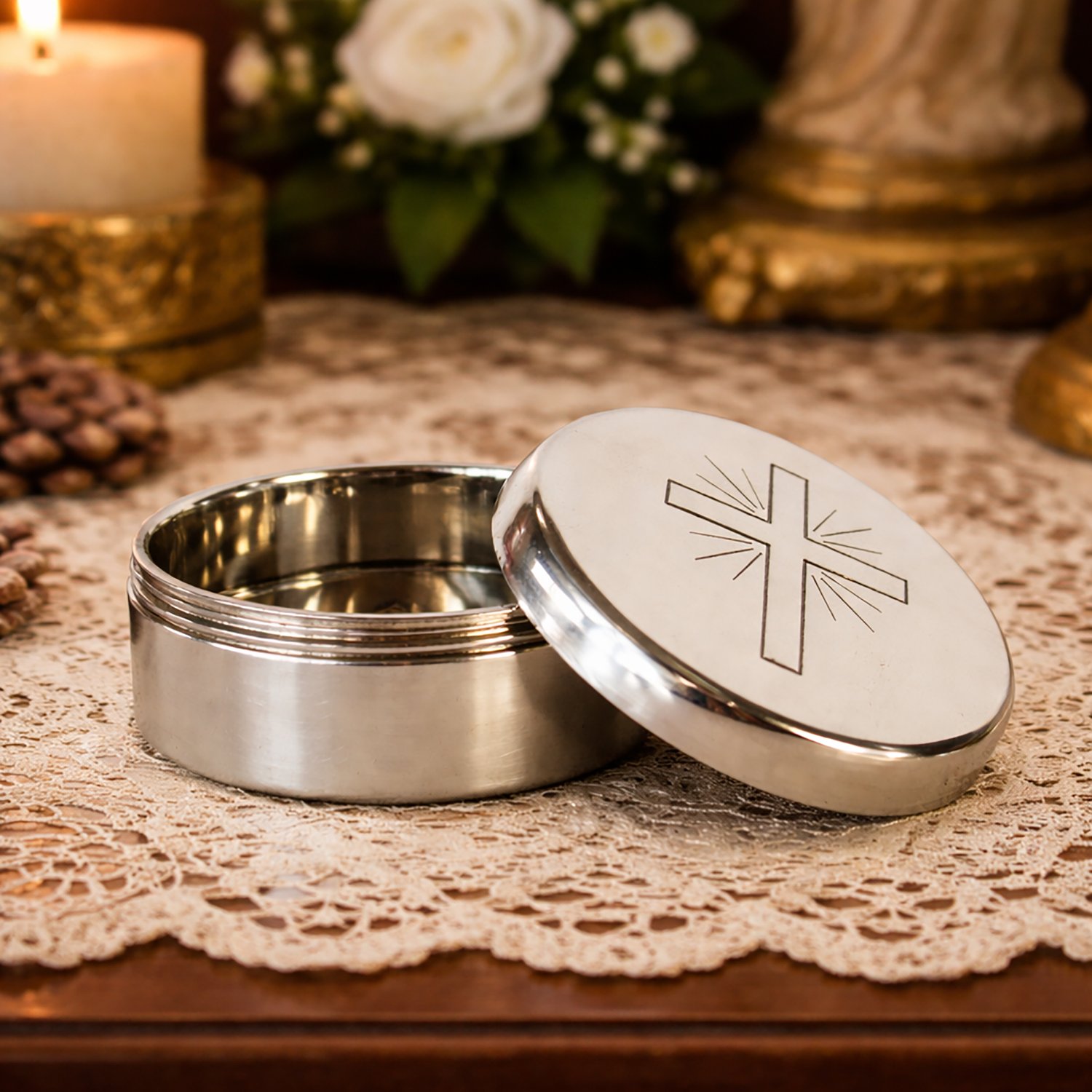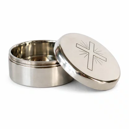 A teca é uma caixinha redonda, fabricada em metal, onde são colocadas partículas para os ministros levarem a comunhão aos enfermos.
