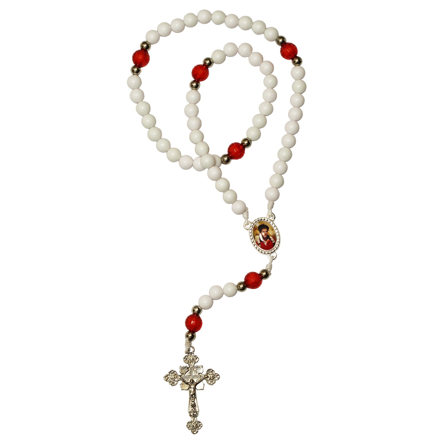 Com contas brancas e vermelha translúcida, este modelo traz um toque refinado para sua oração diária.