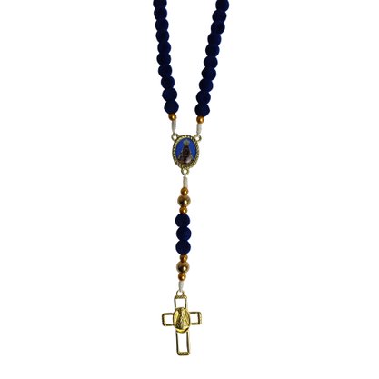 Elegância e devoção à padroeira do Brasil. Contas em camurça azul, cordão branco e acabamentos dourados: entremeio com imagem resinada e cruz delicada.