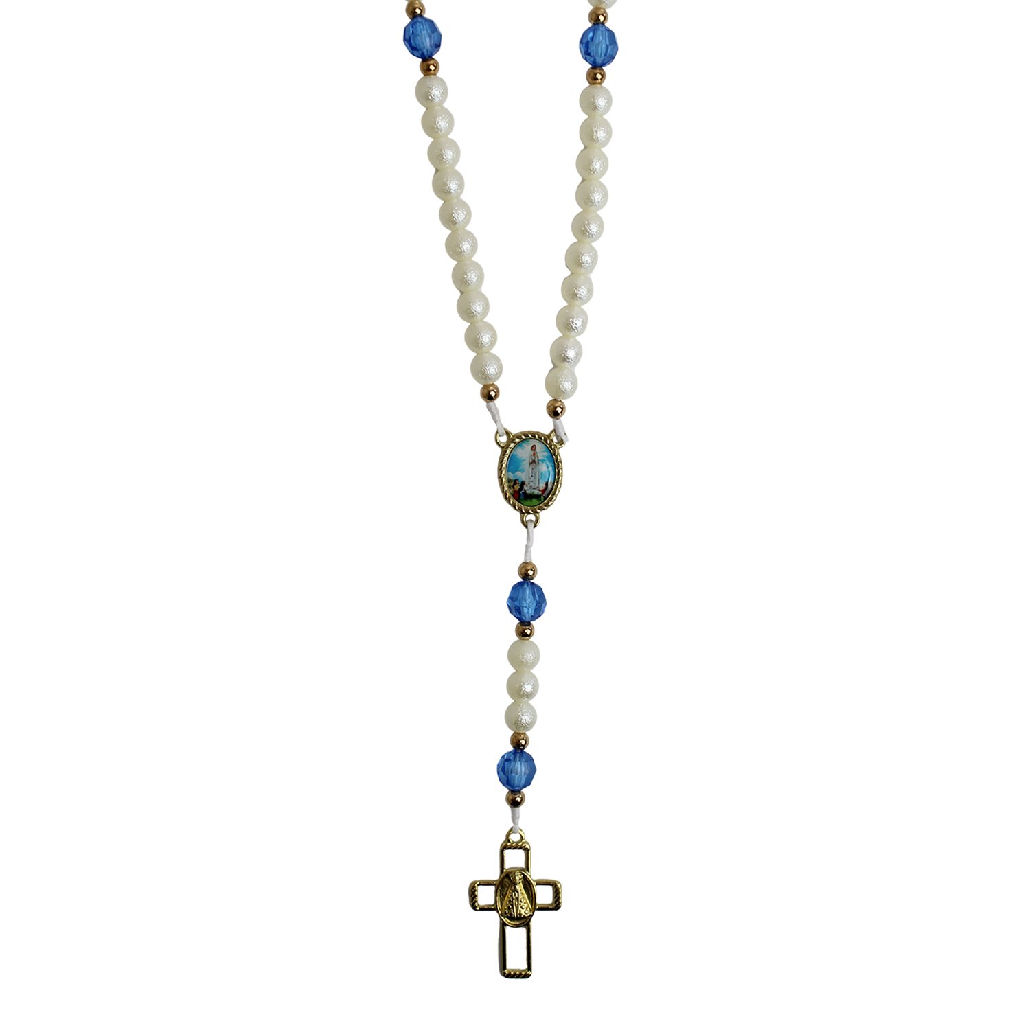 Suave e delicado, com contas pérola branca, cordão branco e detalhes dourados. O entremeio e a cruz dourada refletem a luz da devoção à Virgem de Fátima.