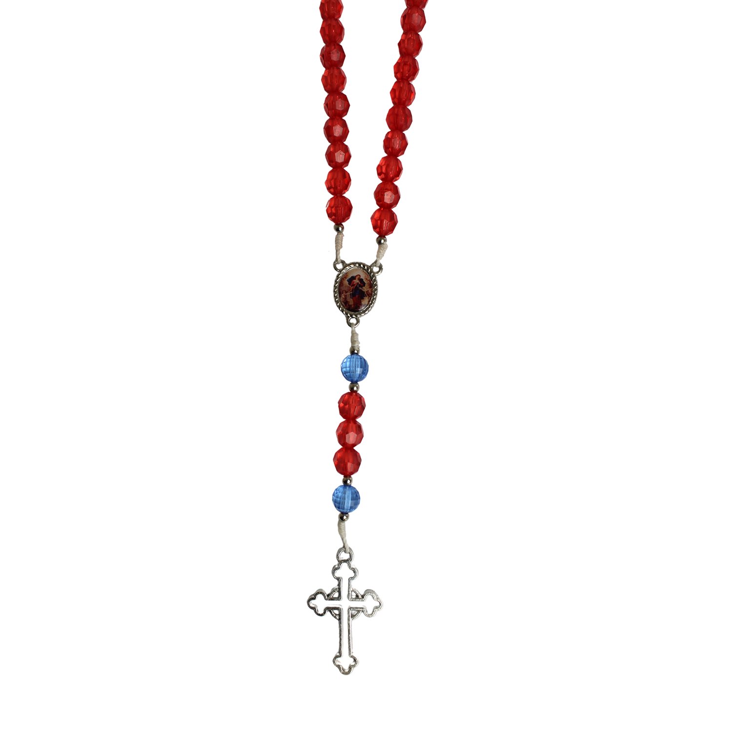 Um terço que expressa confiança e entrega. Contas em semi cristal vermelho transparente, cordão branco, com cruz e entremeio prateados em destaque.