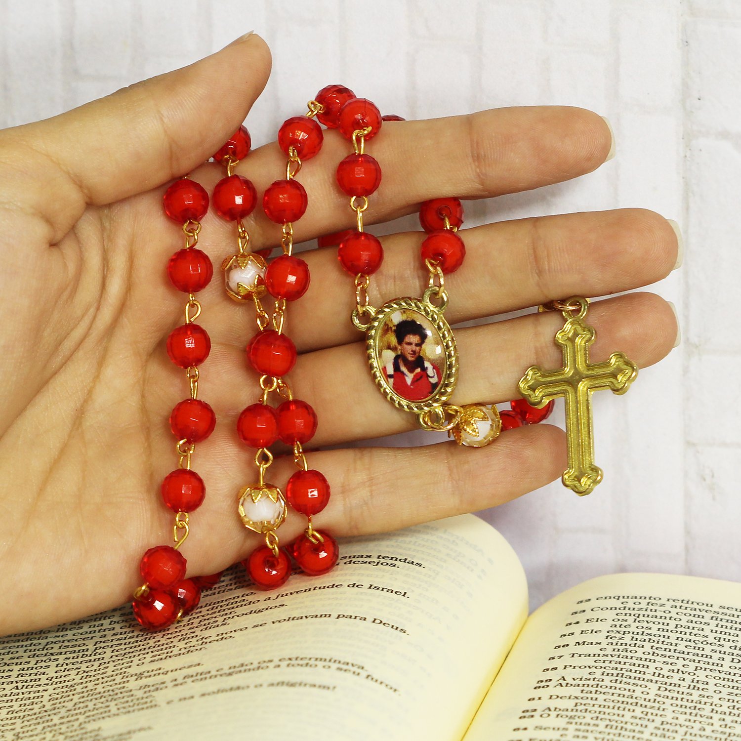 Terço de São Carlo Acutis Semi Cristal Vermelho e Dourado