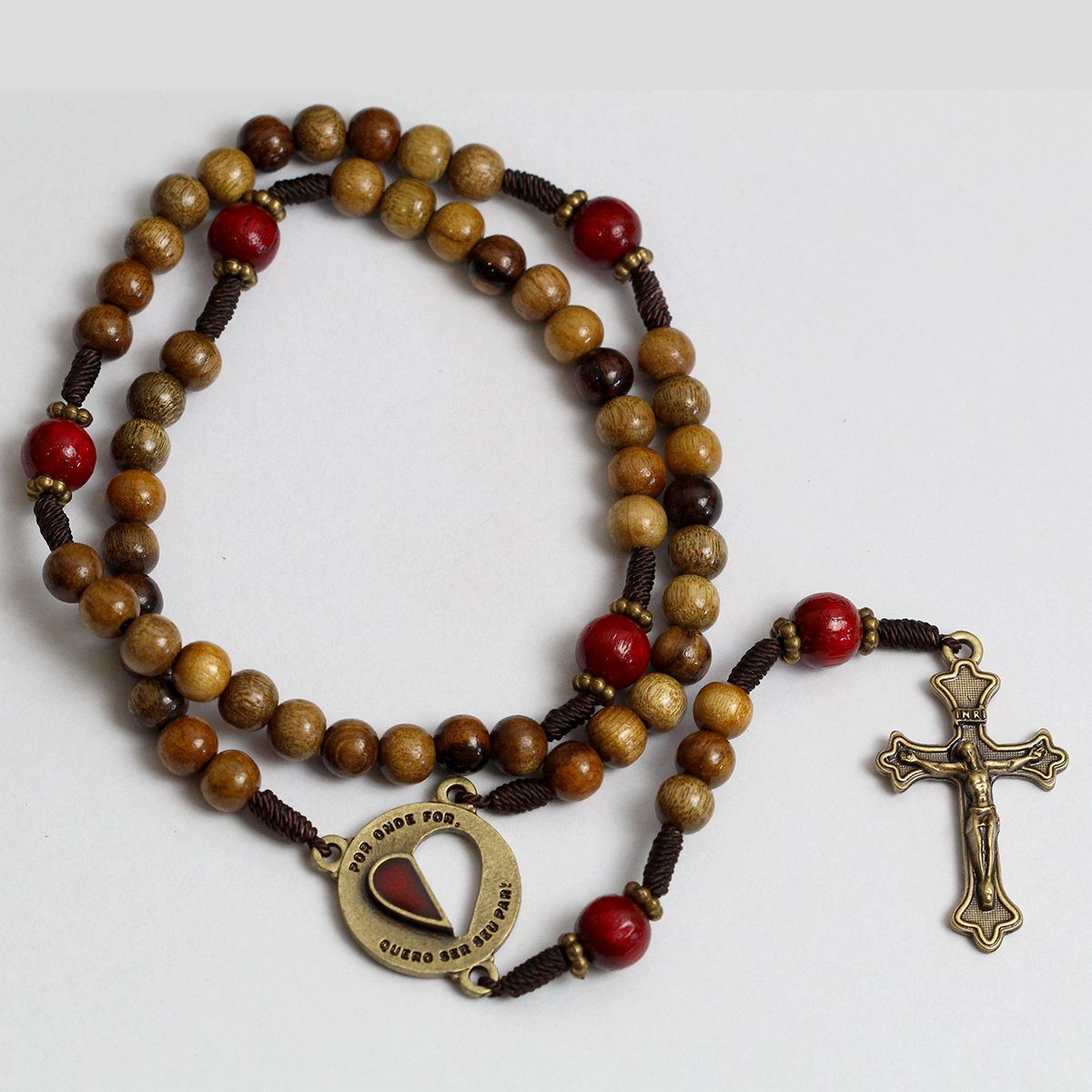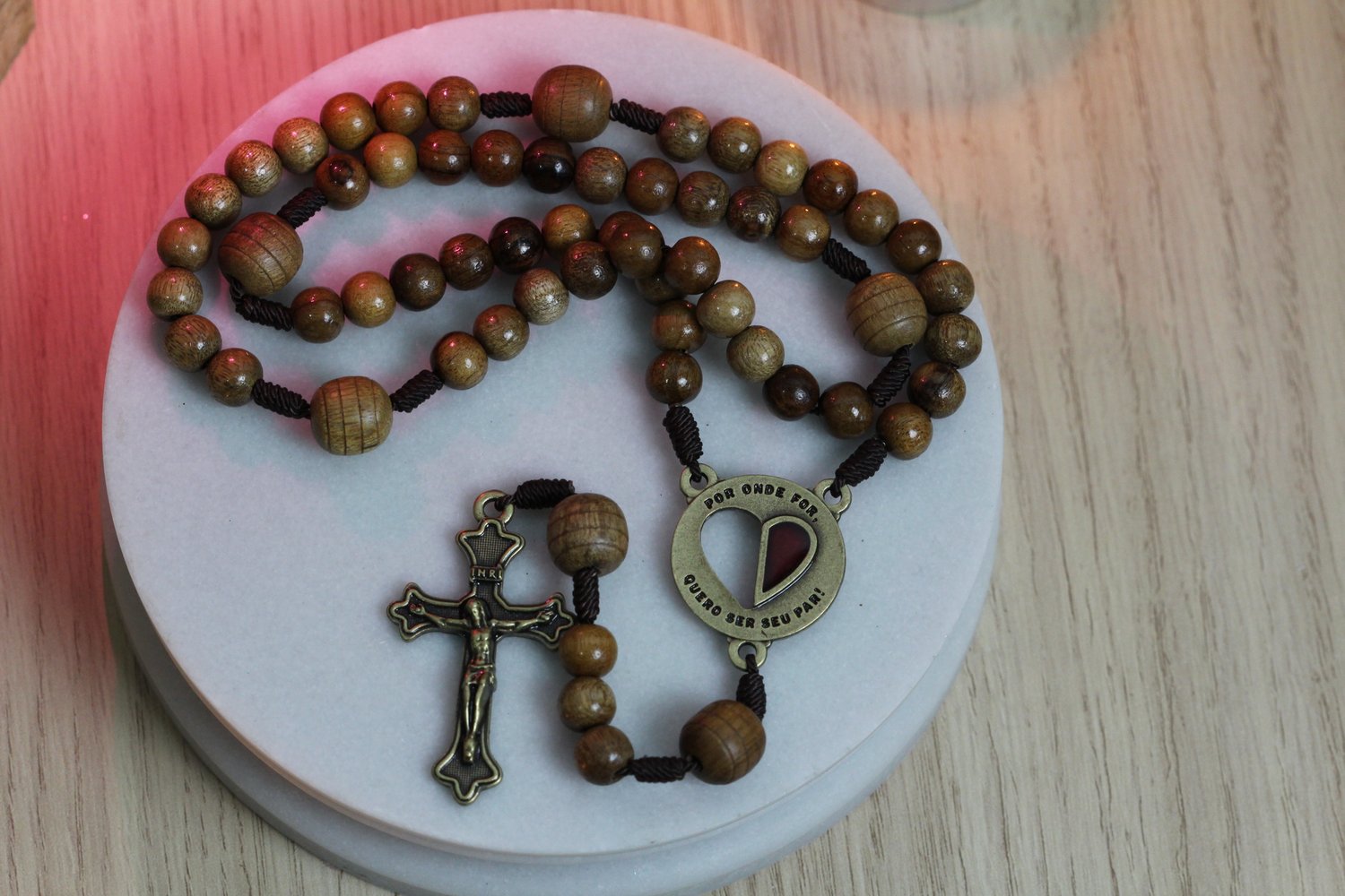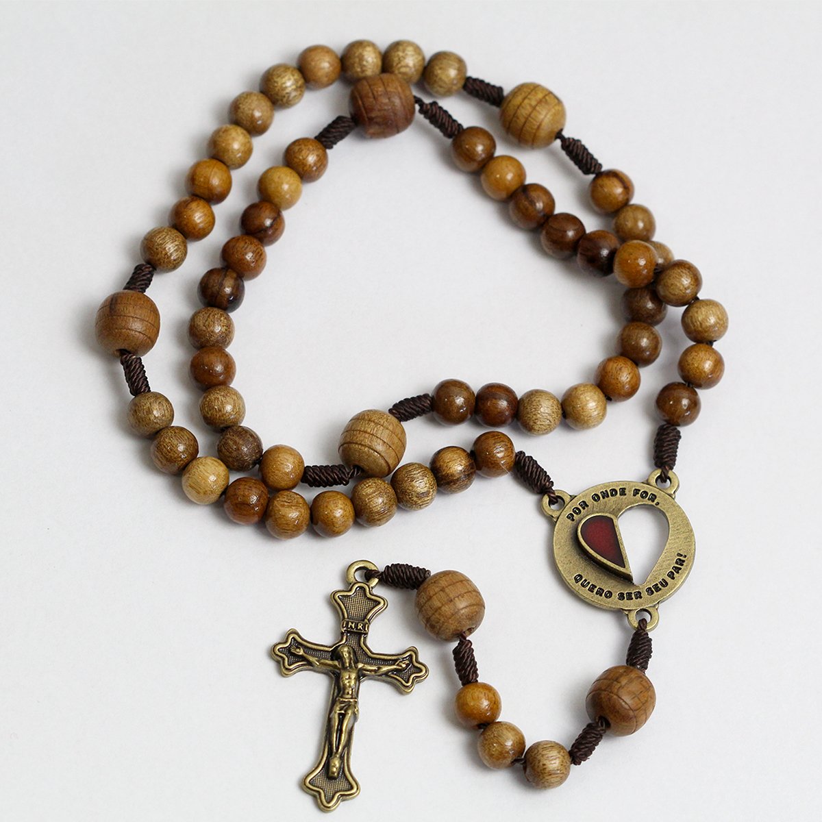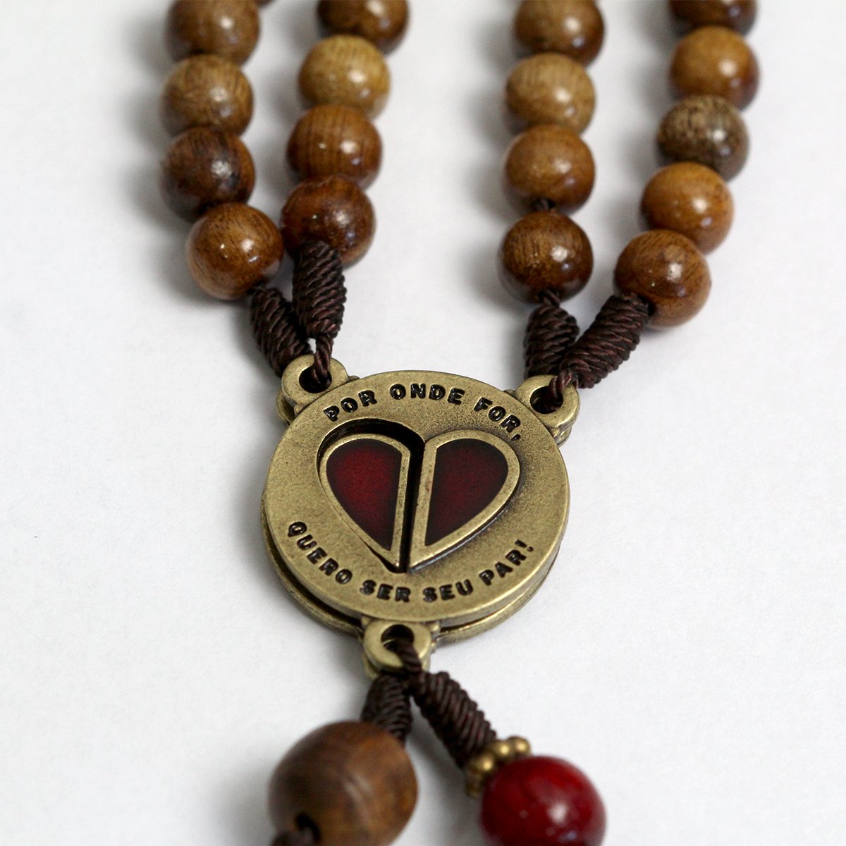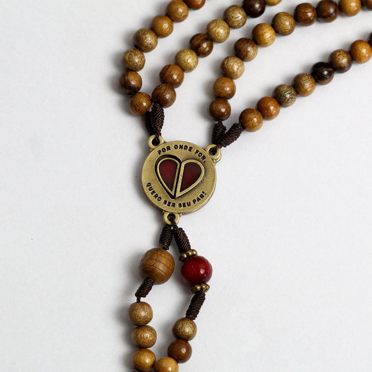 Dois Terços de Madeira Imbuia 8mm que Unem-se no Entremeio Formando uma Medalha Coração com Inscrição "Por onde for, quero ser seu par"
