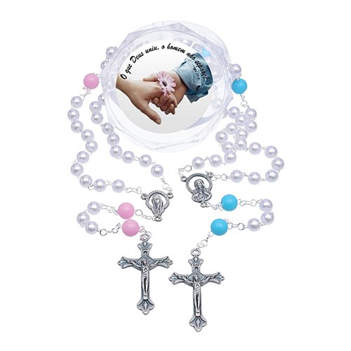 Terço pérola para casais, mulher contas rosas e homem contas azuis.