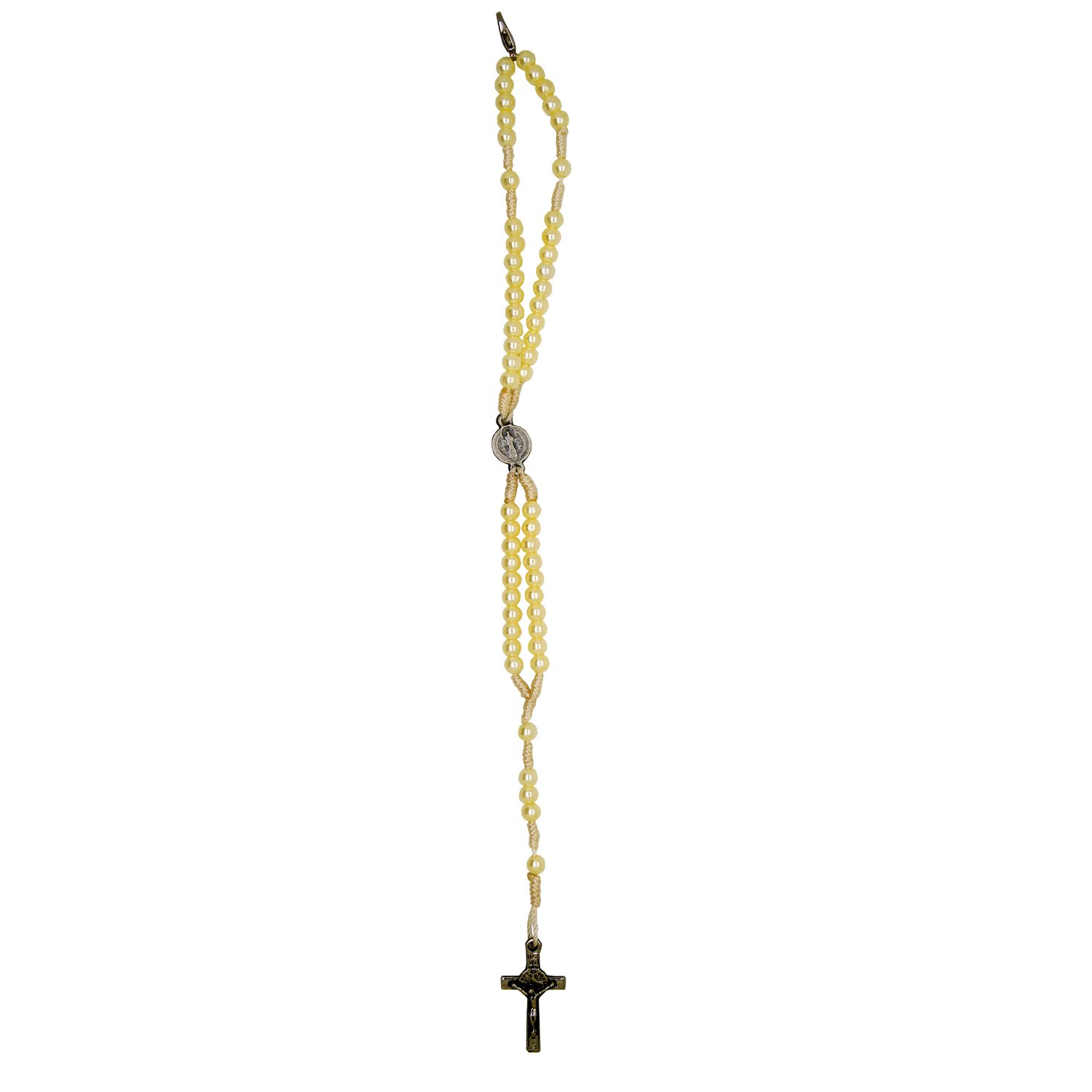 Terço para pulso contas pérolas brancas com medalha de São Bento.