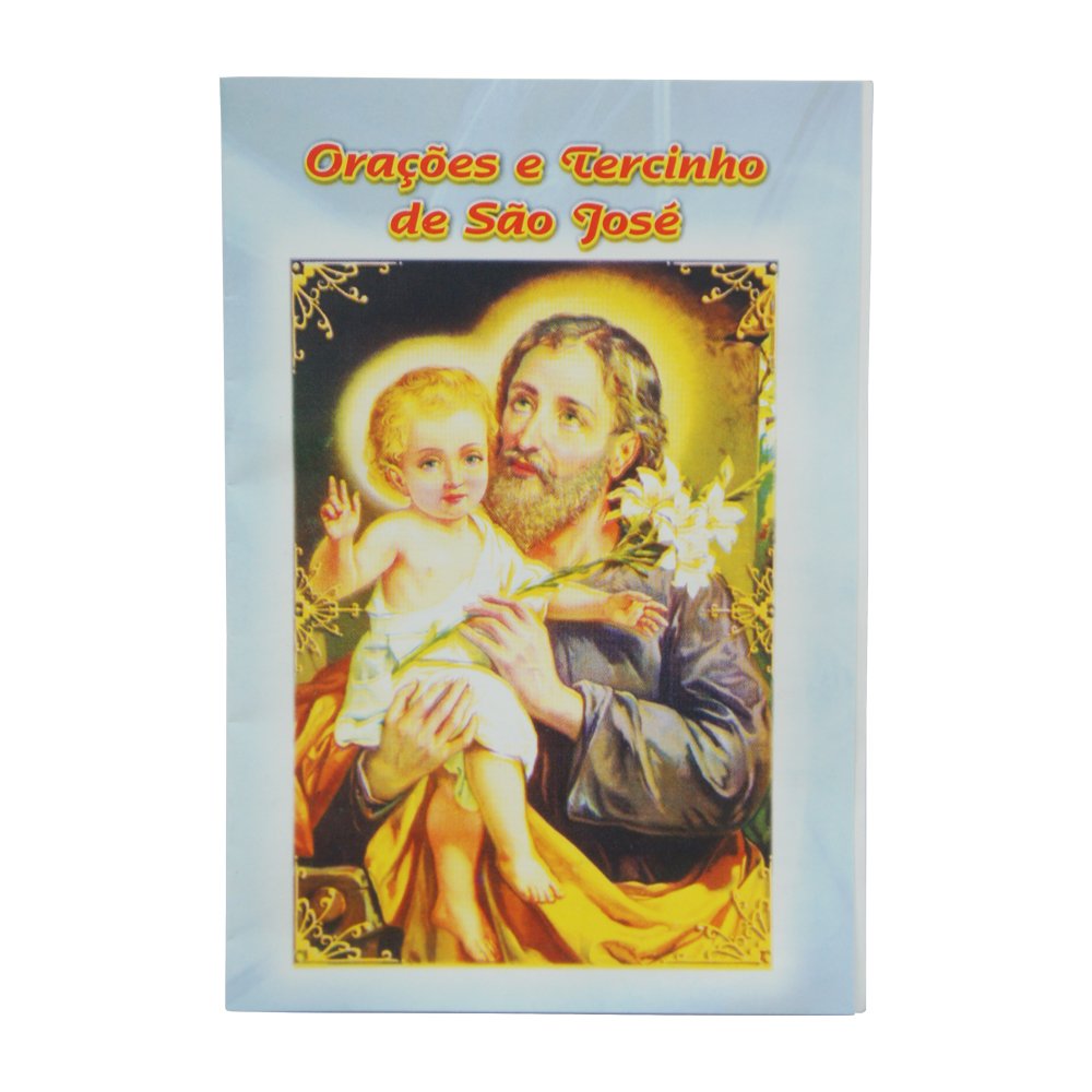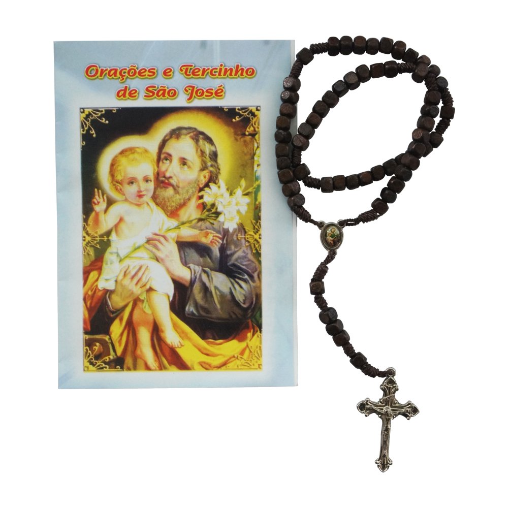 Terço em contas de madeira, entremeio de São José, acompanha Oração de São José. Terço medindo aproximadamente 29cm de altura, folheto oração 13cm de altura e 9cm de largura.