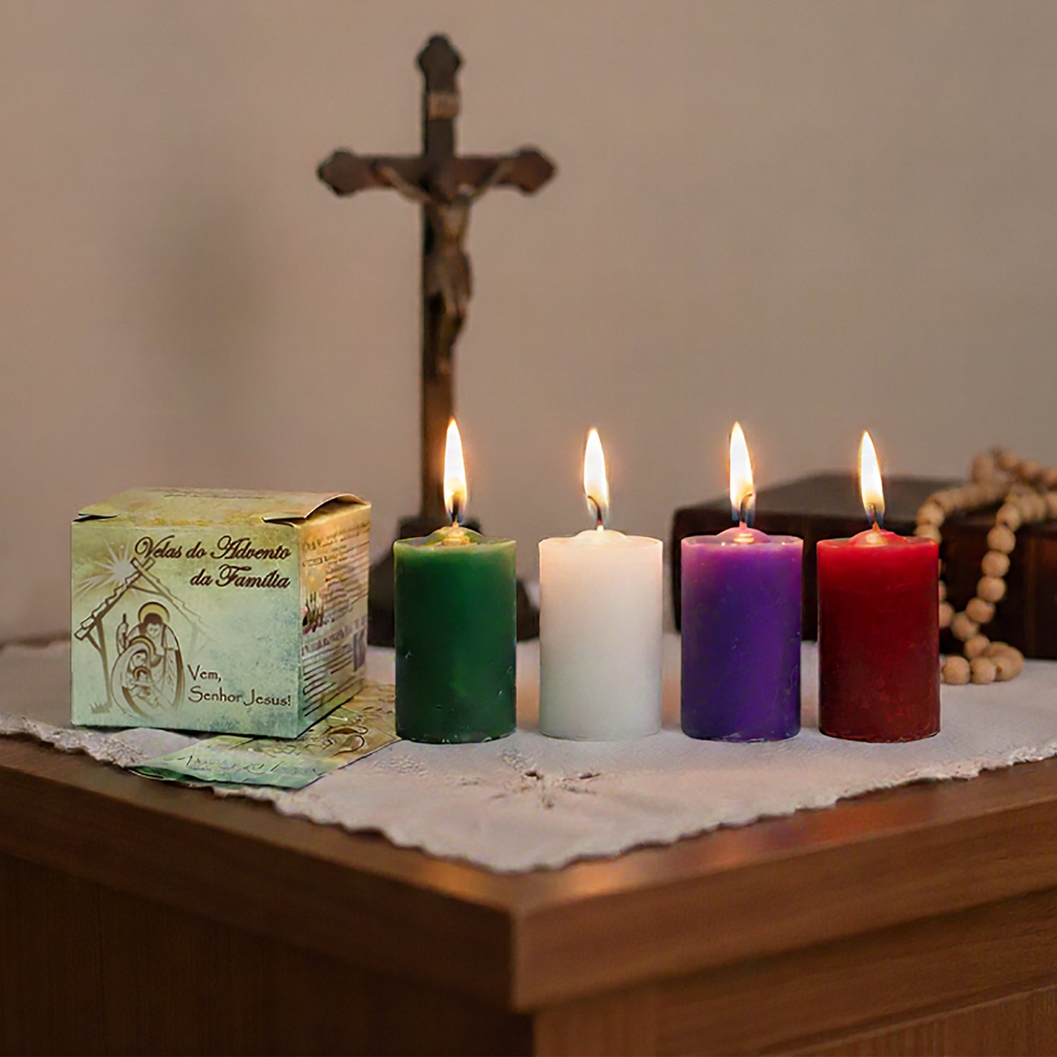 Contém 4 velas do Advento de 100 g cada, das seguintes cores: vermelha, roxa, verde e branca. cada vela mede aproximadamente 7 cm de altura e 4,4 cm de diâmetro.