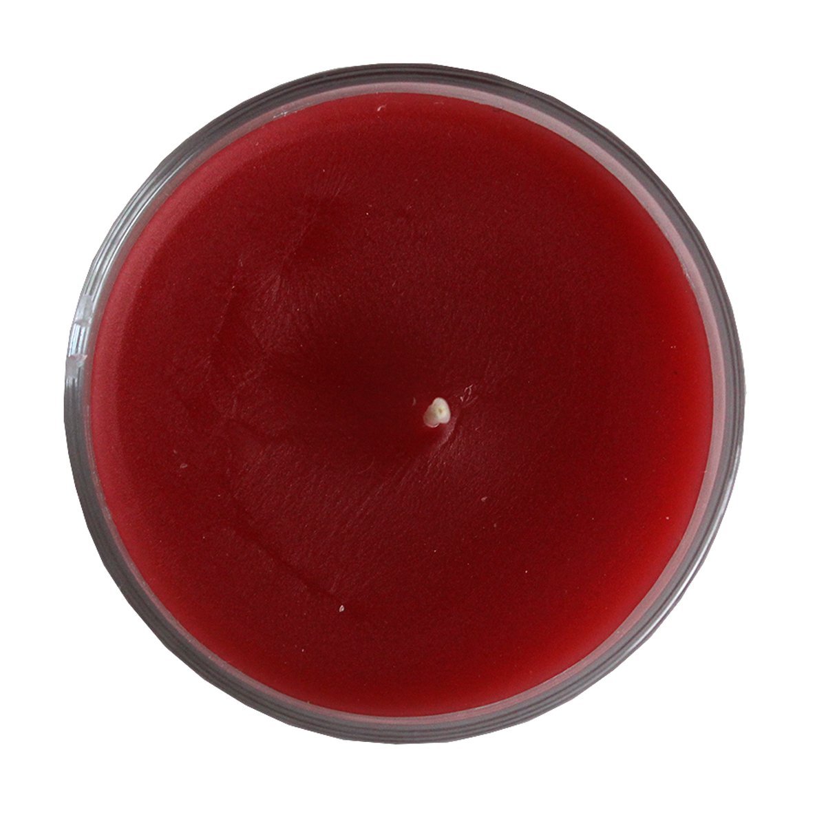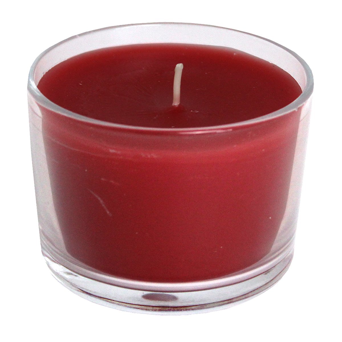 Vela no vidro, recipiente medindo 5,5 cm de altura e 7,5 cm de diâmetro, vela na cor vermelho.