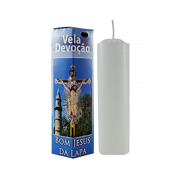 A Vela de Devoção Bom Jesus da Lapa é produzida em parafina de alta qualidade, com aproximadamente 13 cm de altura e 3,2 cm de diâmetro, garantindo uma queima uniforme e segura.