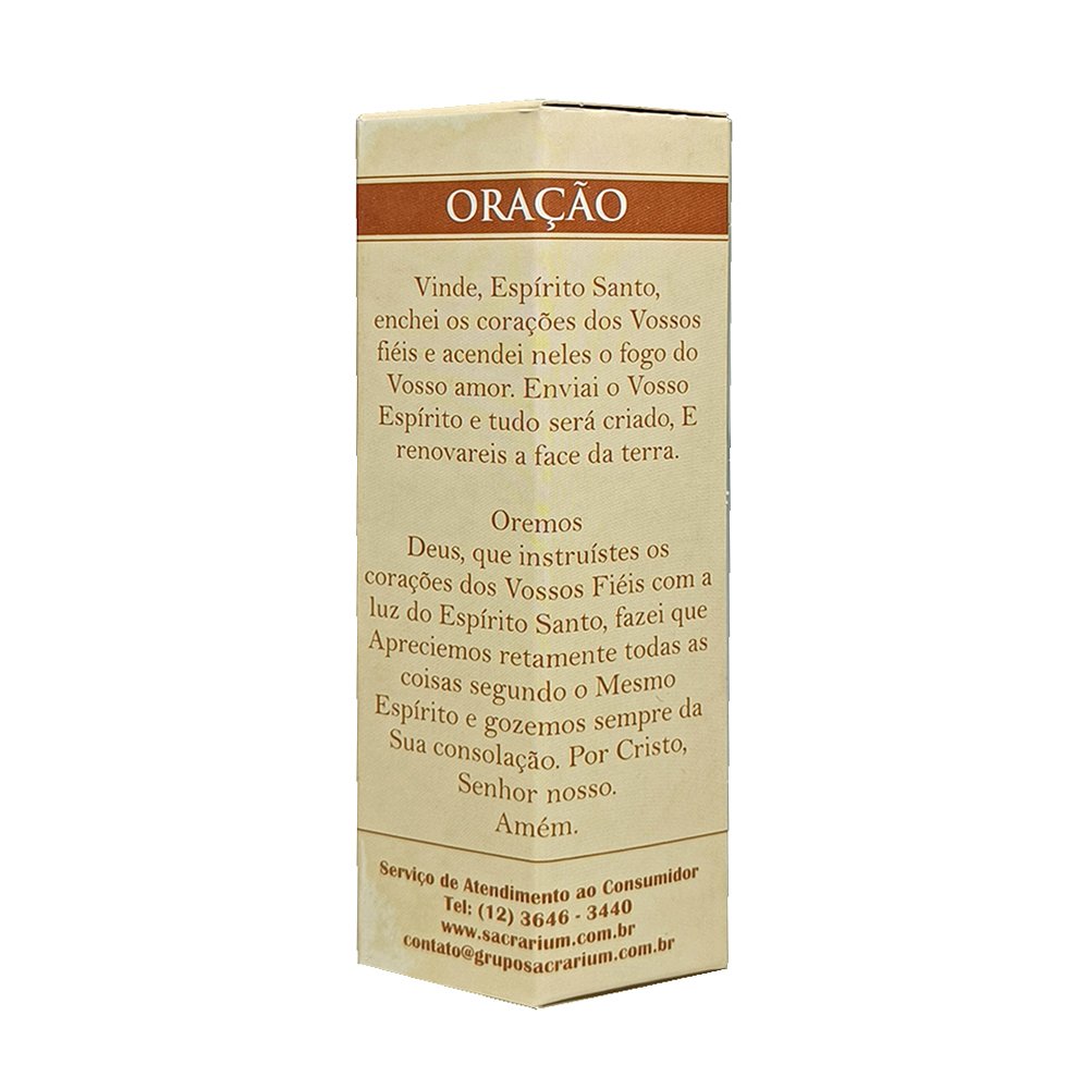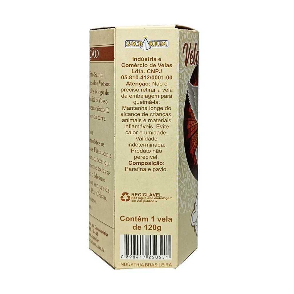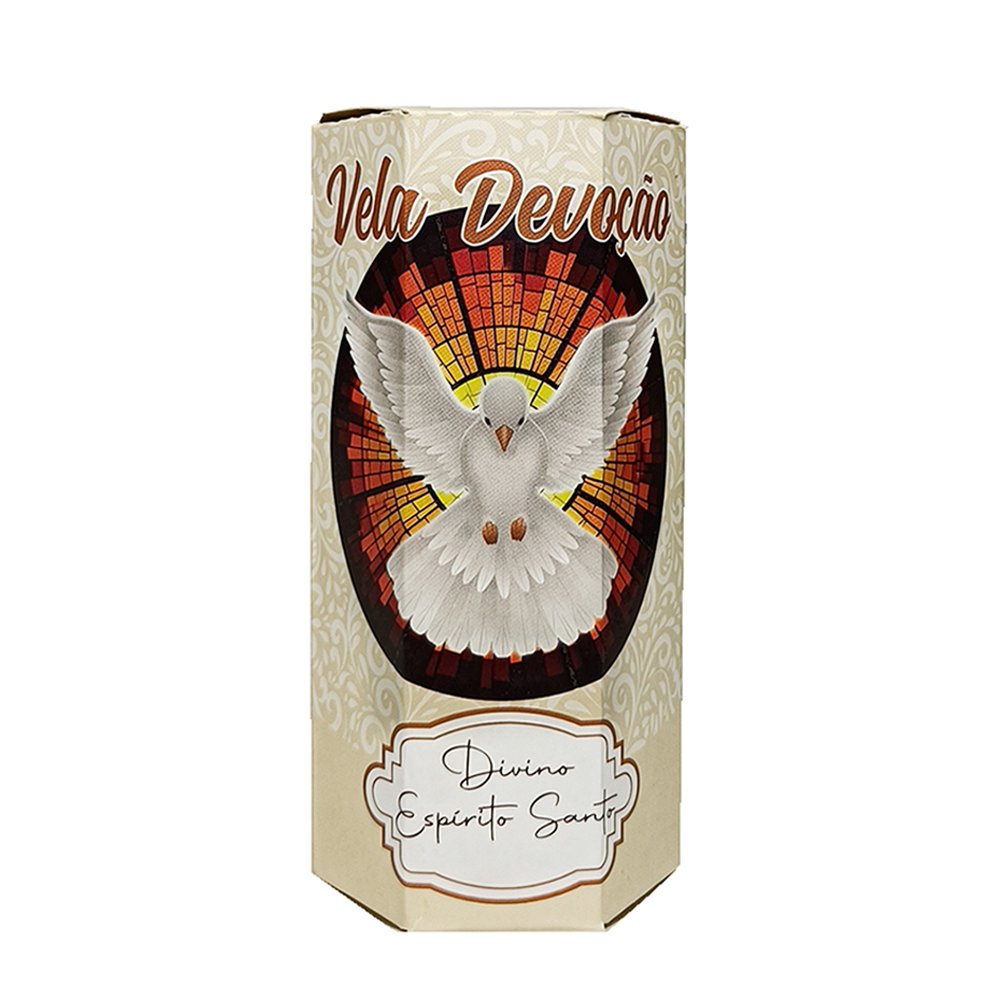 A Vela de Devoção Divino Espírito Santo é produzida em parafina de alta qualidade, com aproximadamente 11 cm de altura e 3,5 cm de diâmetro, garantindo uma queima uniforme e segura.