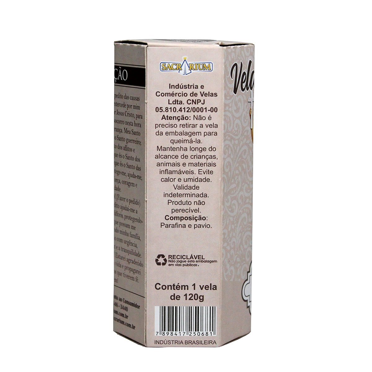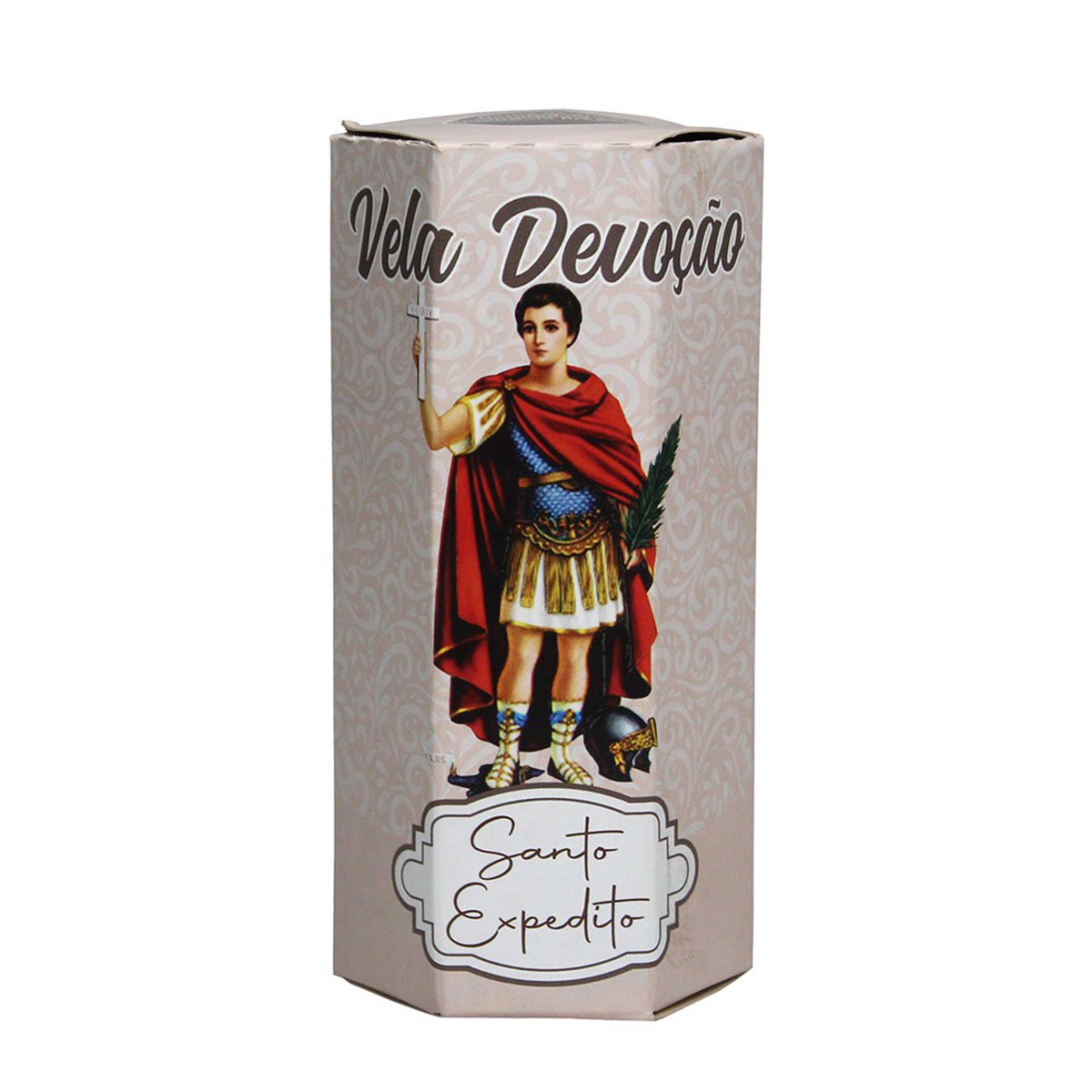 A Vela de Santo Expedito é produzida em parafina de alta qualidade, com aproximadamente 11 cm de altura e 3,5 cm de diâmetro, garantindo uma queima uniforme e segura.