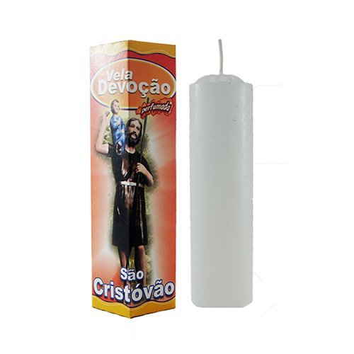 A Vela de Devoção São Cristóvão é produzida em parafina de alta qualidade, com aproximadamente 13 cm de altura e 3,2 cm de diâmetro, garantindo uma queima uniforme e segura.
