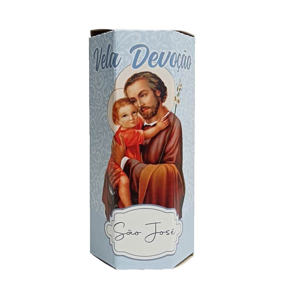 Vela fabricada em parafina, com 11 cm de altura e 3,5 cm de diâmetro, a caixinha tem 12 cm de altura e 5 cm de largura, vem com a oração do Santo de Devoção estampado na caixinha, ainda tem picote nas abas superiores para serem destacadas para facilitar a queima da vela que indicamos ser na própria caixa, que tem cobertura anti-chama.