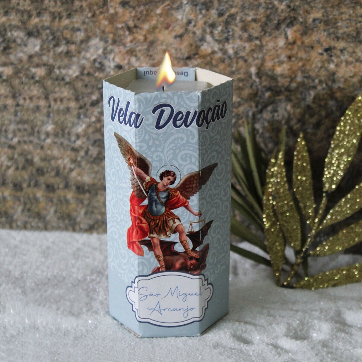 A Vela de São Miguel Arcanjo é produzida em parafina de alta qualidade, com aproximadamente 11 cm de altura e 3,5 cm de diâmetro, garantindo uma queima uniforme e segura.